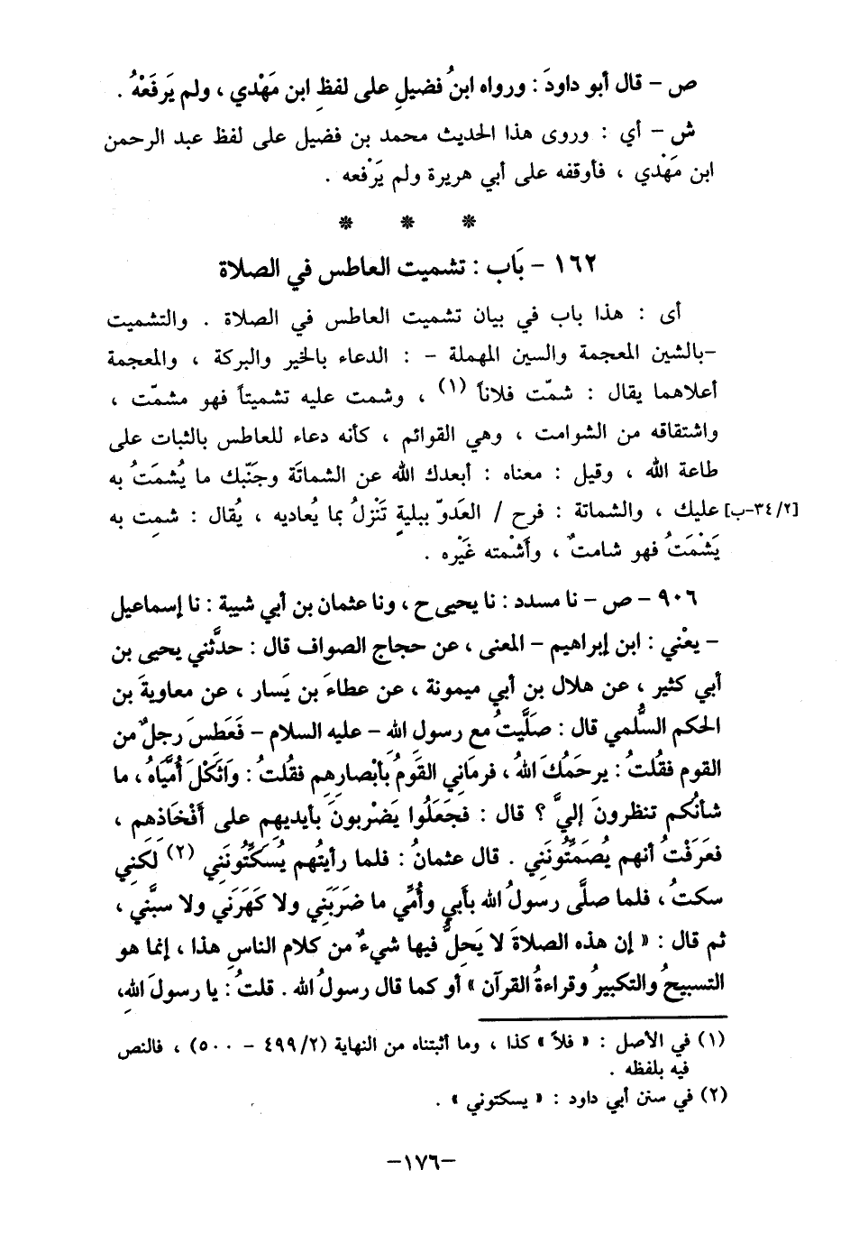 - يعْني: ابن إبراهيم- المعنى، عن حجاج الصواف قال: حدَّثني يحيي بن أبي كثير، عن هلال بن أبي ميمونة، عن عطاءَ بن يَسار، عن معاويةَ بن الحكم السلمي قال: صَلَّيتُ مع رسول الله- عليه السلام- فَعَطسَ رجل من القوم فقُلتُ: يرحَمُكَ الله، فرمَانِي القًومُ بَأبْصارِهم فقُلتُ: وَاثكلَ أمياهُ، ما شأنكم تنظرون ليَّ؟ قال: فجَعَلُوا يَضْربونً بأيديهم على أَفْخَاذهم، فعَرَفْتُ أنهم يُصَمتونَني. قال عثمانُ: فلما رأيتُهم يُسَكتُونَنِي (2) لَكَنِي سكتُ، فلما صلَّى رسولُ الله بأبي وأمي ما ضَرَبَنِي ولا كَهَرَني ولا سبَّني، ثم قال: " أن هذه الصلاةَ لا يَحل فيها شيء من كلام الناسِ هذا، إنما هو التسبيحُ والتكبيرُ وقراءةُ القرآن " أو كما قال رسولُ الله. قلتُ: يا رسولَ الله"
