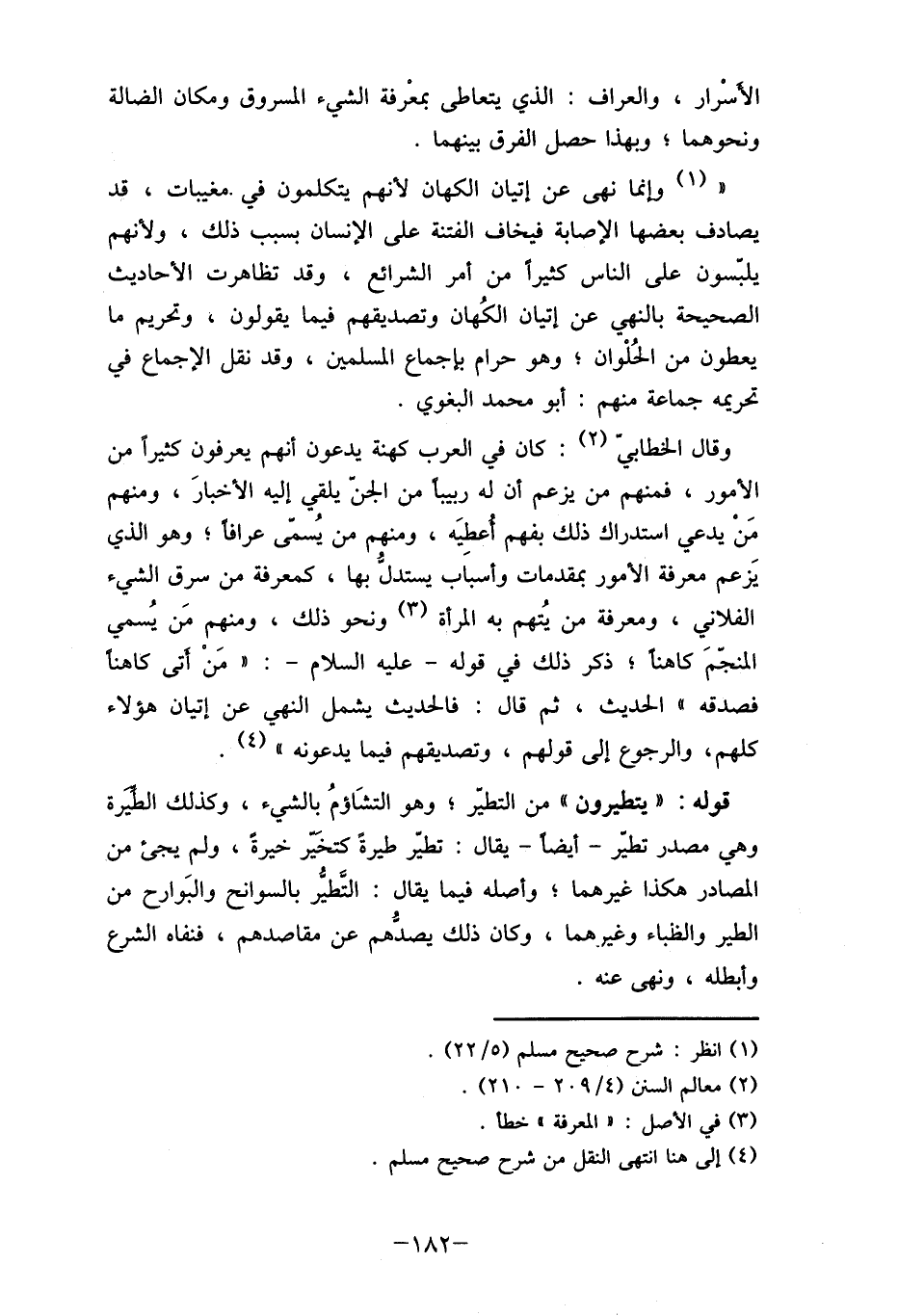 " (1) وإنما نهى عن إتيان الكهان لأنهم يتكلمون في. مغيبات، قد يصادف بعضها الإصابة فيخاف الفتنة على الإنسان بسبب ذلك، ولأنهم يلبسون على الناس كثيرا من أمر الشرائع، وقد تظاهرت الأحاديث الصحيحة بالنهي عن إتيان الكُهان وتصديقهم فيما يقولون، وتحريم ما يعطون من الحُلْوان؛ وهو حرام بإجماع المسلمين، وقد نقل الإجماع في تحريمه جماعة منهم: أبو محمد البغوي.
