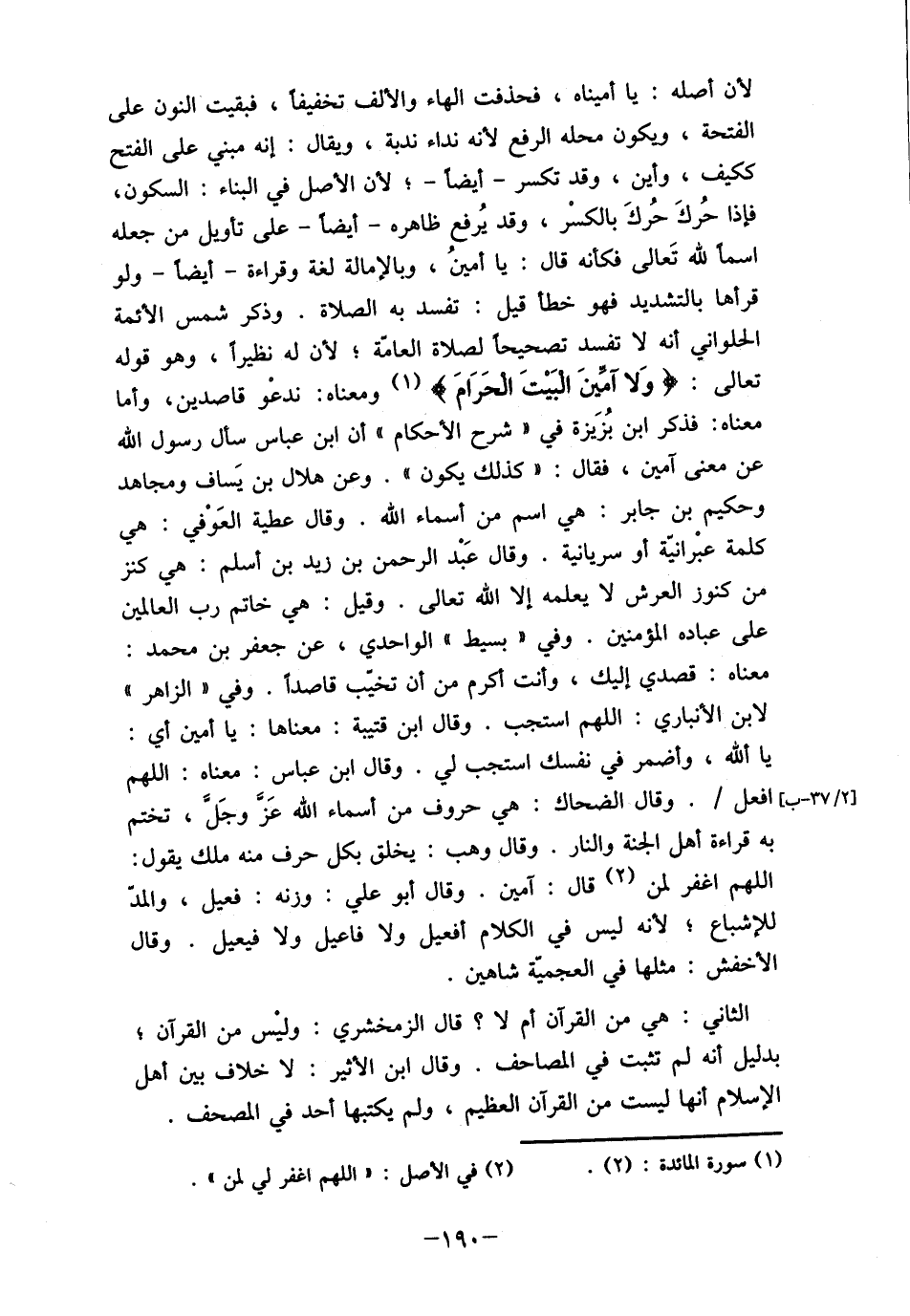 تعالى: "وَلا آمينَ البَيْتَ الحَرَامَ " (1) ومعناه: ندعو قاصدين، وأما