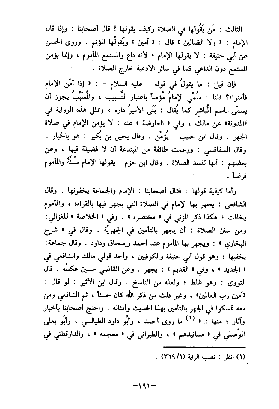 الثالث: مَن يَقُولها في الصلاة وكيف يقولها؟ قال أصحابنا: وإذا قال الإمام: "ولا الضالين" قال: "آمين" ويَقولُها المؤتم. وروى الحسن عن أبي حنيفة: لا يقولها الإمام لأنه دل والمستمع المأموم، وإنما يؤمن المستمع دون الداعي كما في سائر الأدعية خارج الصلاة.