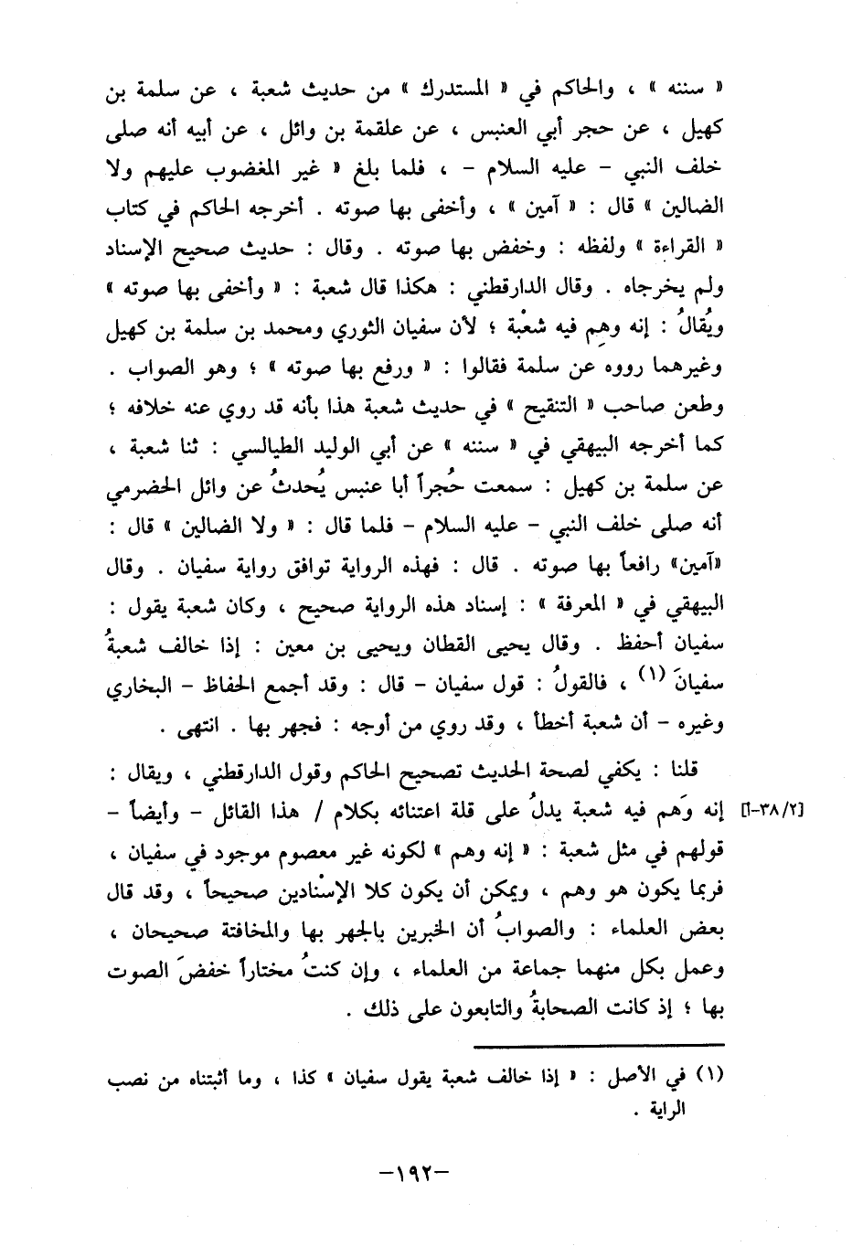 قلنا: يكفي لصحة الحديث تصحيح الحاكم وقول الدارقطني، ويقال: إنه وَهم فيه شعبة يدلُ على قلة اعتنائه بكلام/ هذا القائل- وأيضاً قولهم في مثل شعبة: " إنه وهم" لكونه غير معصوم موجود في سفيان، فربما يكون هو وهم، ويمكن أن يكون كلا الإسنادين صحيحاً وقد قال بعض العلماء: والصوابُ أن الخبرين بالجهر بها والمخافتة صحيحان، وعمل بكل منهما جماعة من العلماء، وإن كنتُ مختارا خفضَ الصوت بها؛ إذ كانت الصحابةُ والتابعون على ذلك.
