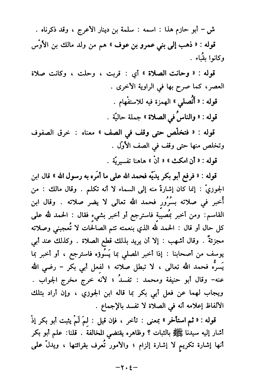 قوله: " فرفع أبو بكر يدَيْه فحمد الله على ما أمَره به رسول الله " قال ابن الجوزيّ: إنما كان إشارة منه إلى السماء لا أنه تكلم. وقال مالك: من أُخبر في صلاته بسُرُور فحمد الله تعالى لا يضر صلاته. وقال ابن القاسم: ومن أخبر بمُصيبة فاسترجع أو أخبر بشيء فقال: الحمد لله على كل حال أو قال: الحمد لله الذي بنعمته تتم الصالحات لا تُعجبني وصلاته مجزئة. وقال أشهب: إلا أن يريد بذلك قطع الصلاة. وكذلك عند أبي يوسف من أصحابنا: إذا أخبر المصلي بما يَسُوؤه فاسترجع، أو أخبر بما يَسرة فحمد الله تعالى، لا تبطل صلاته؛ لفِعل أبي بكر- رضي الله عنه- وقال أبو حنيفة ومحمد: تفسدُ؛ لأنه خرج مخرج الجواب. ويجاب لهما عن فعل أبي بكر بما قاله ابن الجوزي، وأن أراد بتلك الألفاظ إعلامه أنه في الصلاة لا تفسد بالإجماع.