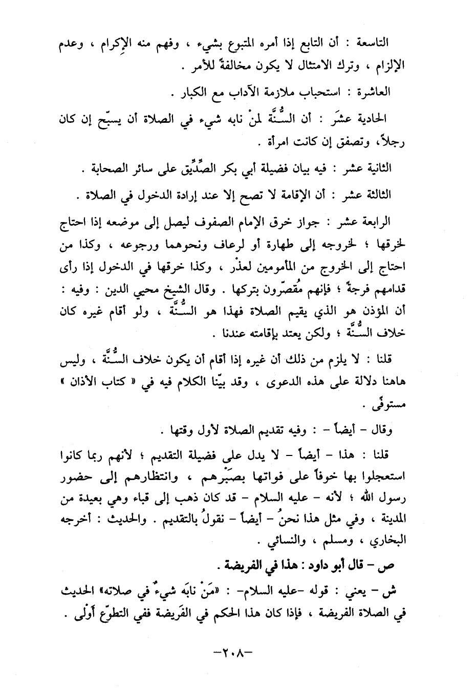 الثالثة عشر: أن الإقامة لا تصح إلا عند إرادة الدخول في الصلاة. الرابعة عشر: جواز خرق الإمام الصفوف ليصل إلى موضعه إذا احتاج لخرقها؛ لخروجه إلى طهارة أو لرعاف ونحوهما ورجوعه، وكذا من احتاج إلى الخروج من المأمومين لعذْر، وكذا خرقها في الدخول إذا رأى قدامهم فرجة؛ فإنهم مُقصّرون بتركها. وقال الشيخ محيي الدين: وفيه: أن المؤذن هو الذي يقيم الصلاة فهذا هو السُّنَّة، ولو أقام غيره كان خلاف السُّنة؛ ولكن يعتد بإقامته عندنا.