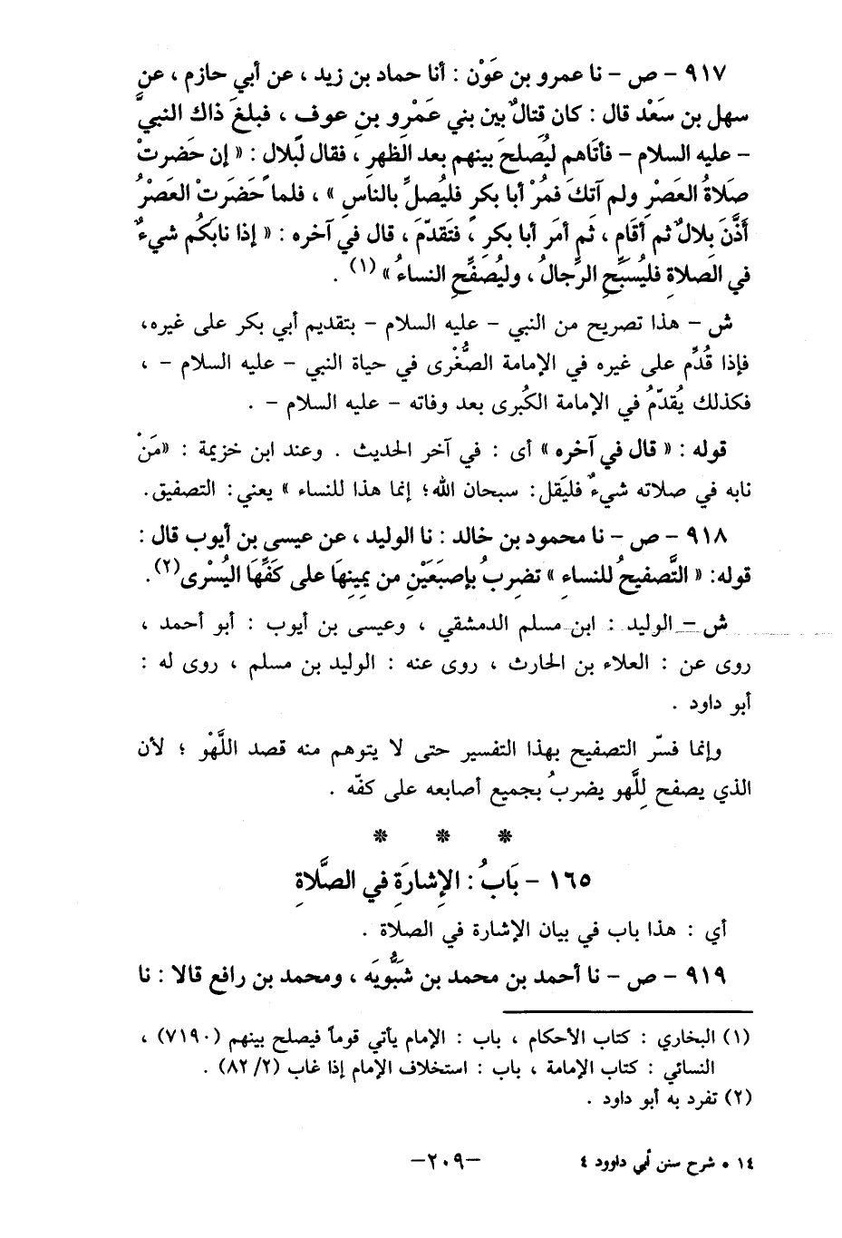 قوله: " قال في آخره " أي: في آخر الحديث. وعند ابن خزيمة: "مَنْ نابه في صلاته شيءٌ فليَقل: سبحان الله. إنما هذا للنساء " يعني: التصفيق. 918- ص- نا محمود بن خالد: نا الوليد، عن عيسى بن أيوب قال: قوله: " التصفيحُ للنساءِ " تضِربُ بإصبَعَيْنِ من يمِينِهَا على كَفهَا اليُسْرى (2) . ش- الوليد: ابق مسلم الدمشقي، وعيسى بن أيوب: أبو أحمد، روى عن: العلاء بن الحارث، روى عنه: الوليد بن مسلم، روى له: أبو داود.