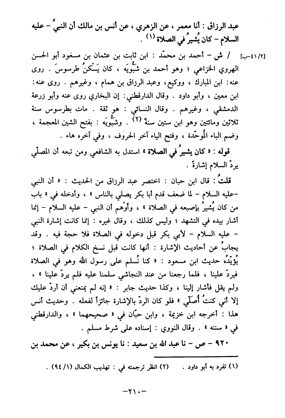 قلتُ: قال ابن حبان: اختصر عبد الرزاق من الحديث: " أن النبي - عليه السلام- لما ضعف قدم أبا بكر يصلي بالناس"، وأدخله في " باب من كان يُشيرُ بإصبعه في الصلاة"، وأوْهم أن النبي- عليه السلام- إنما أشار بيده في التشهد؛ وليس كذلك، وقال غيره: إنما كانت إشارة النبي - عليه السلام- لأبي بكر قبل دخوله في الصلاة فلا حجة فيه. وقد يجابُ عن أحاديث الإشارة: أنها كانت قبل نسخ الكلام في الصلاة؛ يُؤيّدهُ حديث ابن مسعود: "كنا نُسلم على رسول الله وهو في الصلاة فيرد علينا، فلما رجعنا من عند النجاشي سلمنا عليه فلم يرد علينا"، ولم يقل فأشار إلينا، وكذا حديث جابر: "انه لم يمنعني أن أردّ عليك إلا أني كنتُ أصَل" " فلو كان الردّ بالإشارة جائزا لفعله. وحديث أنس هذا: أخرجه ابن خزيمة، وابن حبان في "صحيحهما"، والدارقطني في " سننه ". وقال النووي: إسناده على شرط مسلم.