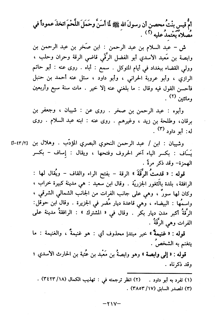 ش- عبد السلام بن عبد الرحمن: ابن صَخر بن عبد الرحمن بن وابصة بن مَعبد الأسدي أبو الفضل الرَّقّي قاضي الرقة وحران وحلب، وولي القضاء ببغداد في أيام المتوكل. سمع: أباه. روى عنه: أبو حاتم الرازي، وأبو عروبة الحراني، وأبو داود، سئل عنه أحمد بن حنبل فأحسن القول فيه وقال: ما بلغني عنه إلا خير. مات سنة سبع وأربعين ومائتين (2) .