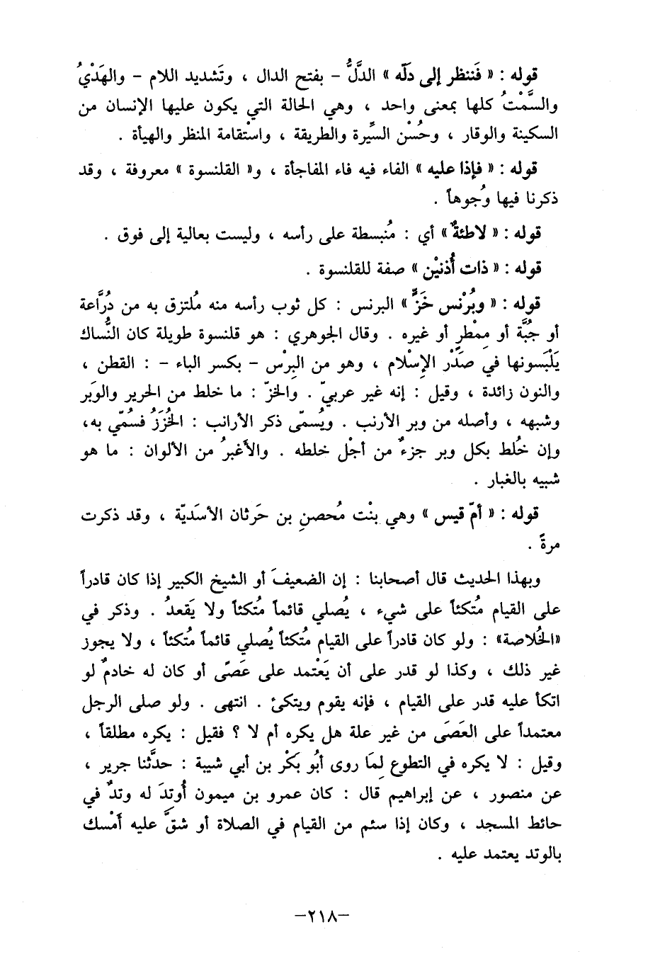 قوله: " فَننظر إلى دله" الدَلُّ- بفتح الدال، وتَشديد اللام- والهَدْيُ والسَّمْتُ كلها بمعنى واحد، وهي الحالة التي يكون عليها الإنسان من السكينة والوقار، وحُسْن السيرة والطريقة، واسْتقامة المنظر والهيأة. قوله: " فإذا عليه " الفاء فيه فاء المفاجأة، و" القلنسوة" معروفة، وقد ذكرنا فيها وُجوها.