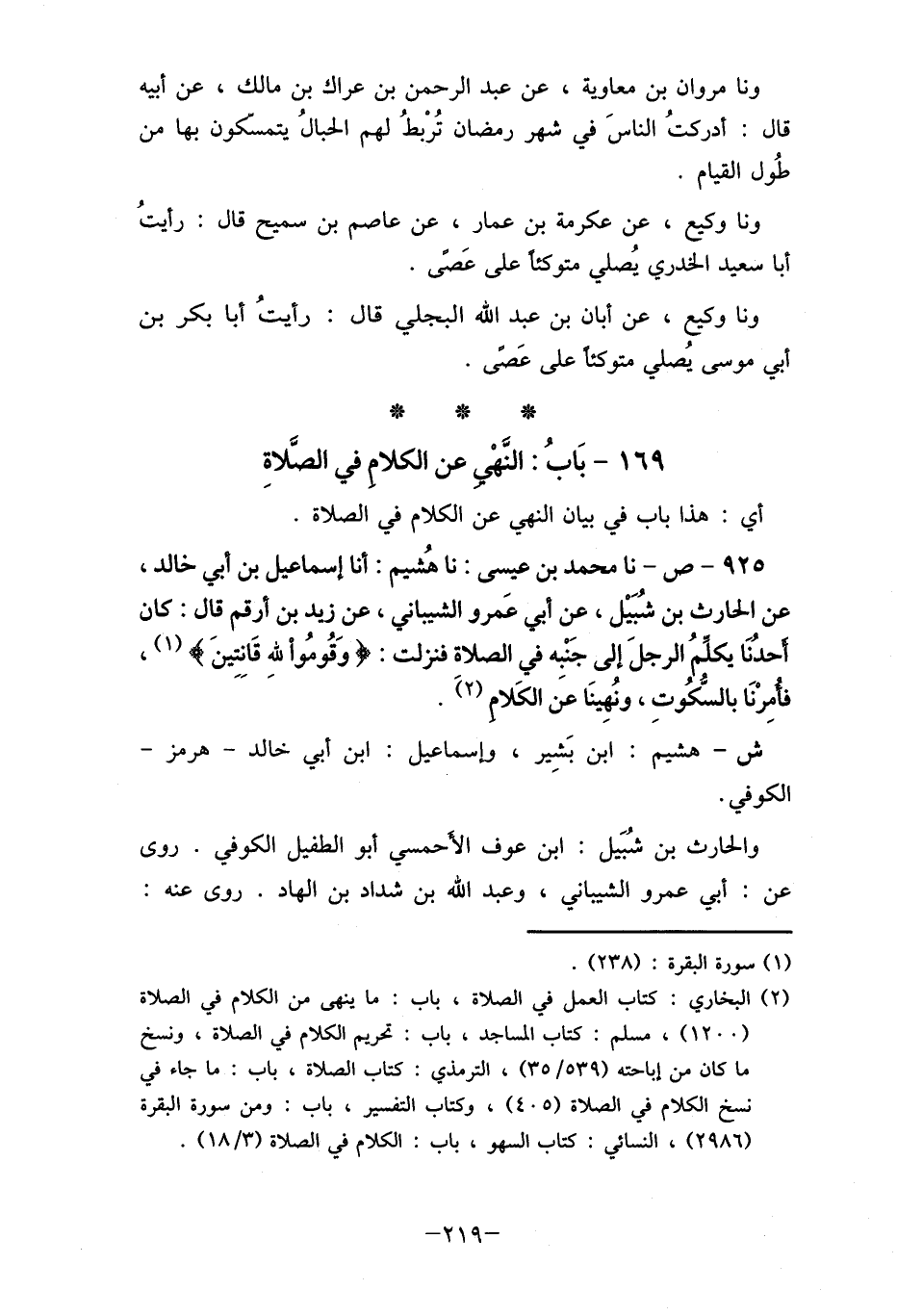 925- ص- نا محمد بن عيسى: نا هُشيم: أنا إسماعيل بن أبي خالد، عن الحارث بن شُبَيْل، عن أبي عَمرو الشيباني، عن زيد بن أرقم قال: كان أحدنَا يكلمُ الرجلَ إلى جَنْبه في الصلاة فنزلت: "وَقُومُوا لله قَانتينَ " (1) ، فأُمِرْنَا بالسُكُوتِ، ونُهِينَا عنَ الكَلام (2) .