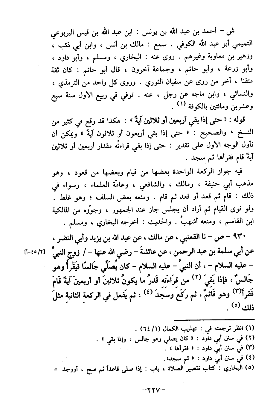 930- ص- نا القعنبي، عن مالك، عن عبد الله بن يزيد وأبي النضر، عن أبي سلمه بن عبد الرحمن، عن عائشةَ- رض الله عنها-/ زوج النبي - عليه السلام-، أن النبي- عليه السلام- كان يُصَلي جَالسًا فيَقرأ وهو جَالس، فإذا بَقِيَ (2) من قِرَاءَتِهِ قَدرُ ما يكونُ ثلاثينَ أو أربعينَ أَيةً قَامَ فَقرأ وهو قَائم، ثم رَكَع وسجدَ (4) ، ثم يَفعل في الركعة الثانية مثلَ ذلك (5) .َ