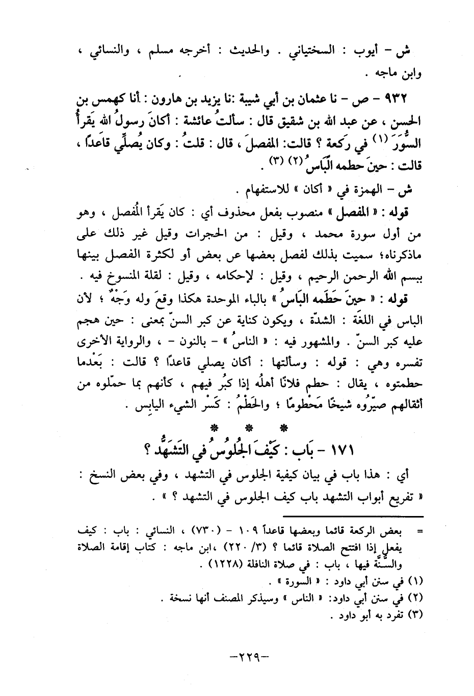 932- ص- نا عثمان بن أبي شيبة: نا يزيد بن هارون:.أنا كهمس بن الحسن، عن عبد الله بن شقيق قال: سألتُ عائشة: كانَ رسولُ اللْه يَقرأ السُّوَرَ (1) في رَكعة؟ قالت: المفصلَ، قال: قلتُ: وكان يُصلِّي قاعدا، قالت: حين حطمه الباسُ (2) (3) .