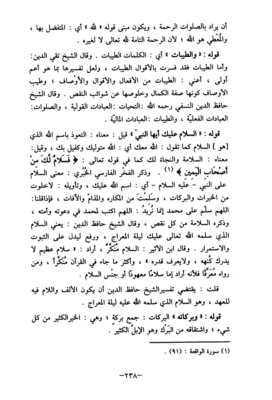 قوله: "السلام عليك أيها النبيّ، قيل: معناه: التعوذ باسم الله الذي [هو] السلام كما تقول: الله معك أي: الله متوليك وكفيل بك، وقيل: معناه: السلامة والنجاة لك كما في قوله تعالى: "فسلام لكَ منْ أصْحَاب اليَمين" (1) . وذكر الفخْر الفارسي الخُبْري: معنى السلَام على النبَي- عَليه السلام- أي: اسم الله عليك، وتأويله: لا خلوت من الخيرات والبركات، وسًلِمْتَ من المكاره والمذامّ والآفات، فإذا قلنا: اللهم صلي على محمد إنما نُريدُ: اللهم اكتب لمحمد في دعوته وأمته، وذكره السلامة من كل نقص، وقال الشيخ حافظ الدين: يعني السلام الذي سلمه الله تعالى عليك ليلة المعراج، ورفع ليدل على الثبوت والاستمرار. وقال ابن الأثير: السلام مُنكر، أراد: " سلام عظيم لا يدرك كُنهه، ولا يعرف قدره"، وكثر ما جاء في القرائن مُنكَّرا، ومن رواه مُعَرفا فلأنه أراد إما سلاما معهودة أو جنْس السلام.