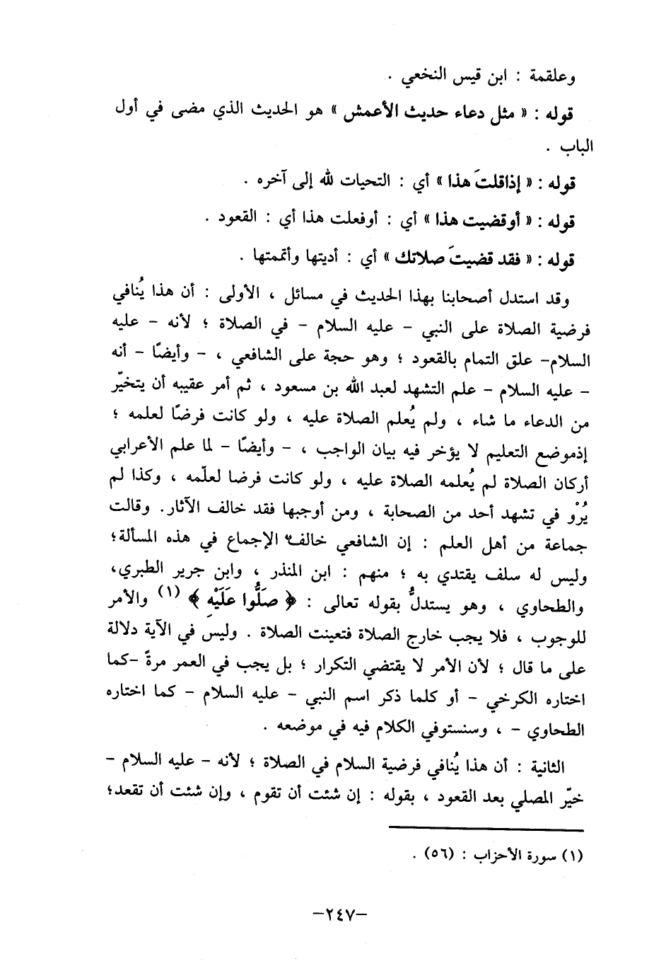 وقد استدل أصحابنا بهذا الحديث في مسائل، الأولى: أن هذا يُنافي فرضية الصلاة على النبي- عليه السلام- في الصلاة؛ لأنه- عليه السلام- علق التمام بالقعود؛ وهو حجة على الشافعي،- وأيضًا- أنه - عليه السلام- علم التشهد لعبد الله بن مسعود، ثم أمر عقيبه أن يتخير من الدعاء ما شاء، ولم يُعلم الصلاة عليه، ولو كانت فرضًا لعلمه؛ إذ موضع التعليم لا يؤخر فيه بيان الواجب،- وأيضًا- لما علم الأعرابي أركان الصلاة لم يُعلمه الصلاة عليه، ولو كانت فرضا لعلّمه، وكذا لم يُرْو في تشهد أحد من الصحابة، ومن أوجبها فقد خالف الآثار. وقالت جماعة من أهل العلم: إن الشافعي خالف الإجماع في هذه المسألة؛ وليس له سلف يقتدي به؛ منهم: ابن المنذر، وابن جرير الطبري، والطحاوي، وهو يستدل بقوله تعالى: "صلوا عَلَيْه " (1) والأمر للوجوب، فلا يجب خارج الصلاة فتعينت الصلاة. وليسَ في الآية دلالة على ما قال؛ لأن الأمر لا يقتضي التكرار؛ بل يجب في العمر مرةً- كما اختاره الكرخي- أو كلما ذكر اسم النبي- عليه السلام- كما اختاره الطحاوي-، وسنستوفي الكلام فيه في موضعه.