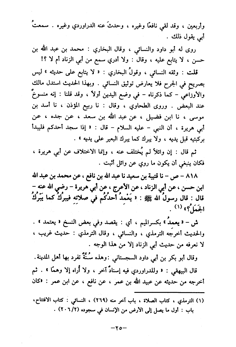 818- ص-نا عتيبة بن سعيد نا عبد الله بن نافع، عن محمد بن عبد الله ابن حسن، عن أبي الزناد، عن الأعرج، عن أبي هريرة- رضي الله عنه- قال: قال رسولُ الله - صلى الله عليه وسلم -: " يَعْمدُ أحدُكُم في صلاته فيبرُكُ كما يَبْرُكُ الجَمَلُ؟ " (1) .ً