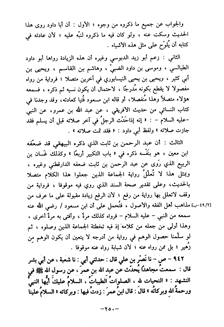 الثاني: زعم أبو زيد الدبوسي وغيره أن هذه الزيادة رواها أبو داود الطيالسي، وموسى بن داود الضبي، وهاشم بن القاسم، ويحي بن أبي كثير، ويحيى بن يحيى النيسابوري في آخرين متصلا؛ فرواية من رواه مفصولا لا يقطع بكونه مُدرجًا، لاحتمال أن يكون نسيه ثم ذكره، فسمعه هؤلاء متصلاً وهذا مُنفصلا، أو قاله ابن مسعود فُتيا كعادته، وقد وجدنا في كتاب النسائي من حديث الأفريقي، عن عبد الله بن عمرو، عن النبي - عليه السلام-: "إنه إذا حدّث الرجلُ في آخر صلاته قبل أن يسلم فقد جازت صلاته " ولفظ أبي داود: "فقد تمت صلاته".