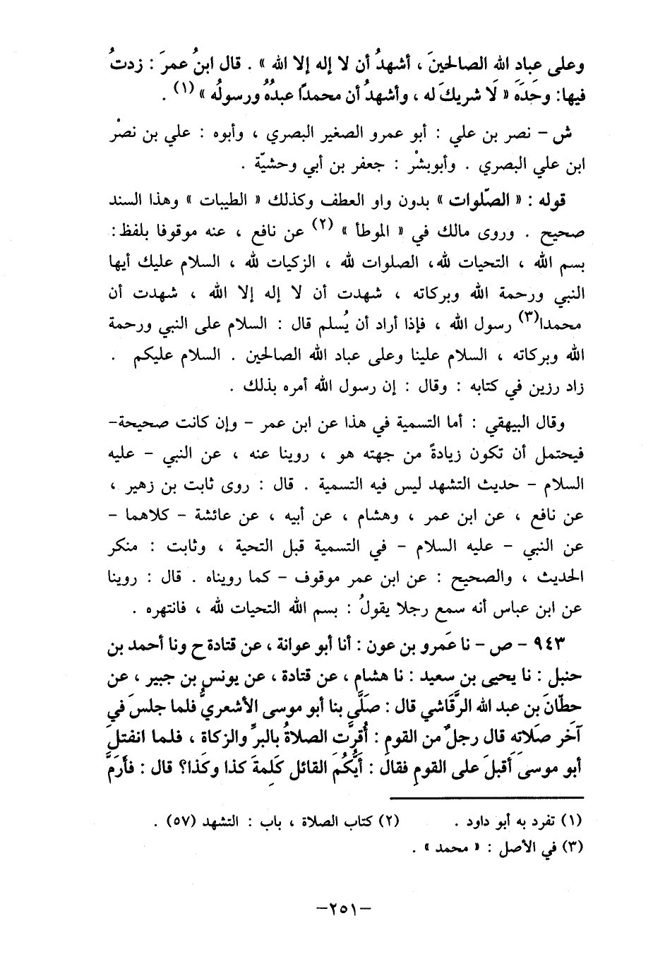 قوله: " الصّلوات " بدون واو العطف وكذلك " الطيبات" وهذا السند صحيح. وروى مالك في " الموطأ " (2) عن نافع، عنه موقوفا بلفظ: بسم الله، التحيات لله، الصلوات لله، الزكيات لله، السلام عليك أيها النبي ورحمة الله وبركاته، شهدت أن لا إله إلا الله، شهدت أن محمداً (3) رسول الله، فإذا أراد أن يُسلم قال: السلام على النبي ورحمة الله وبركاته، السلام علينا وعلى عباد الله الصالحين. السلام عليكم. زاد رزين في كتابه: وقال: إن رسول الله أمره بذلك.