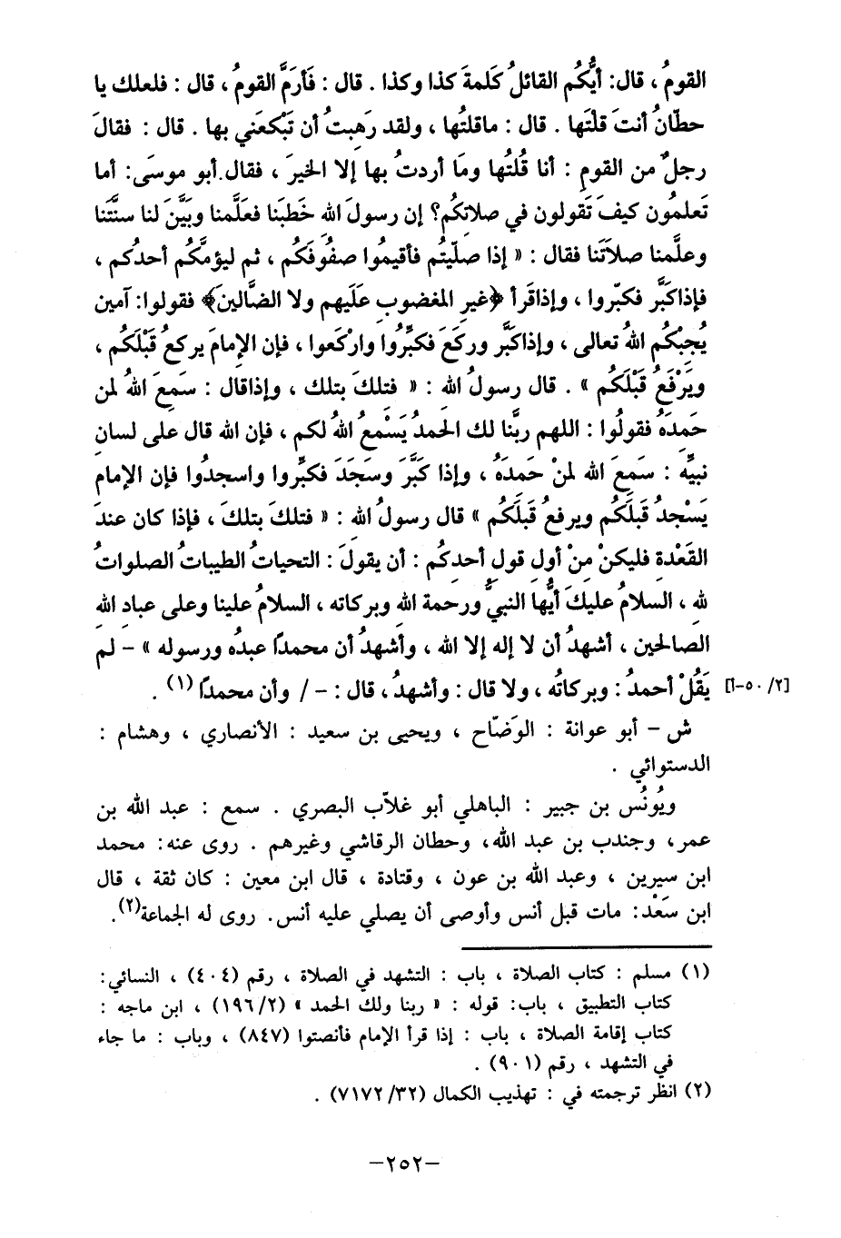 القومُ، قال: أيكُم القائلُ كَلمةَ كذا وكذا. قال: فَأرَم القومُ، قال: فلعلك يا حطانُ أنتَ قلتَها. قال: ما قلتُها، ولقد رَهبتُ أن تَبكعَني بها. قال: فقالَ رجل من القوم: أنا قُلتُها ومَا أردتُ بها إَلا الخيرَ، فقال. أبو موسَى: أما تَعلمُون كيفَ تَقولون في صلاتكُم؟ إن رسولَ الله خَطبَنا فعلمنا وبَيَّنَ لنا سنتنا وعلمنا صلاَتَنا فقال: " إذا صليتُم فأقيمُوا صفُوَفَكُم، ثم ليؤمَّكُم أحدُكم، فإذا كبر فكبروا، وإذا قَرأ "غيرِ المغضوب عَلَيهم ولا الضالينَ " فقولوا: آمين يُجِبكُم الله تعالى، وإذا كبر وركَعَ فكبِّرُواَ وارْكَعوا، فإن الإمامَ يركعُ قَبْلَكُم، ويَرْفَعُ قَبْلَكُم ". قال رسولُ الله: "فتِلكَ بتلك، وإذا قال: سَمِعَ اللهُ لمن حَمِدَهُ فقولُوا: اللهم ربنا لك الحَمدُ يَسْمعُ الله لكم، فإن الله قال على لسانِ نبيه: سَمِعَ الله لمنْ حَمدَهُ، وإذا كبر وسَجَدَ فكبِّروا واسجدُوا فإن الإمام يَسْجدُ قَبلَكُم ويرفعُ قَبلًكُم " قال رسولُ الله: "فتلكَ بتلكَ" فإذا كان عندَ القَعْدة فليكنْ مِنْ أول قول أحدكُم: أن يقوَلَ: التحياتُ الطيباتُ الصلواتُ لله، السَلامُ عليكَ أيهاَ النبي - صلى الله عليه وسلم -رحَمة الله وبركاته، السلامُ علينا وعلى عباد الله الصَالحين، أشهدُ أن لا إله إلا الله، وأَشهدُ أن محمداً عبده ورسوله "- لمَ [2/50 - أ] يَقُلْ أحمدُ: وبركاتُه، ولا قال: وأشهدُ، قال:-/ وأن محمداً (1) .