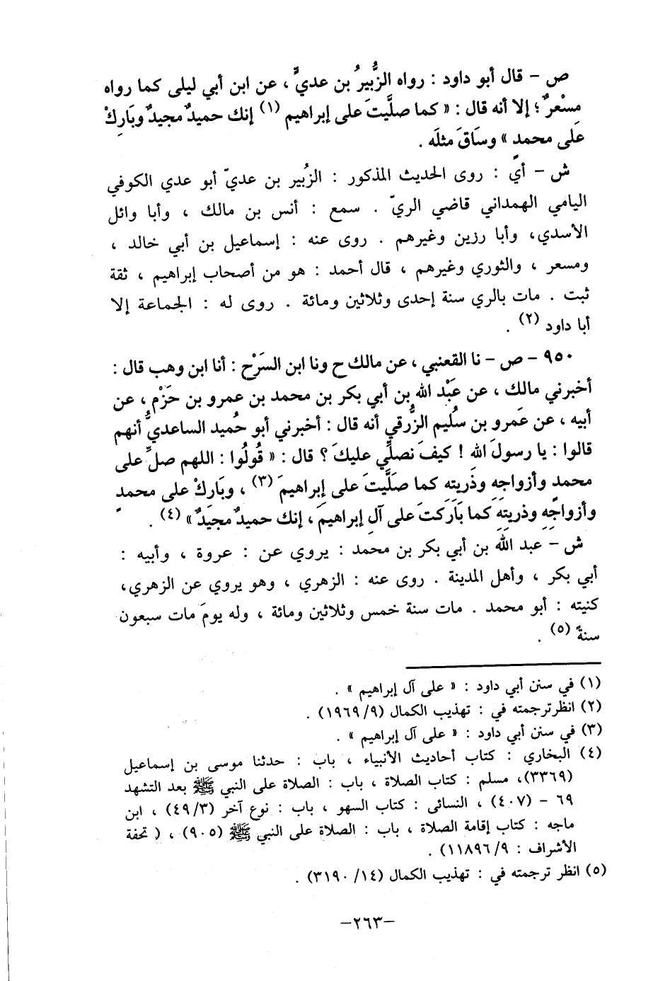 950- ص- نا القعنبي، عن مالك ح ونا ابن السَرحْ: أنا ابن وهب قال: أخبرني مالك، عن عَبْد الله بن أبي بكر بن محمد بن عمرو بن حَزْم، عن أبيه، عن عَمرو بن سُليم الزُّرقي أنه قال: أخبرني أبو حُميد الساعديُّ أنهم قالوا: يا رسولَ اللهِ" كيفَ نصلِّي عليكَ؟ قال: " قُولُوا: اللهم صلّ على محمد وأزواجه وذريته كما صَلَّيتَ على إبراهيمَ (3) ، وبَاركْ على محمد وأزواجهِ وذريتًِه كما بَاَرَكتَ على اَلِ إبراهيمَ، إنك حميد مجيد " (4) .