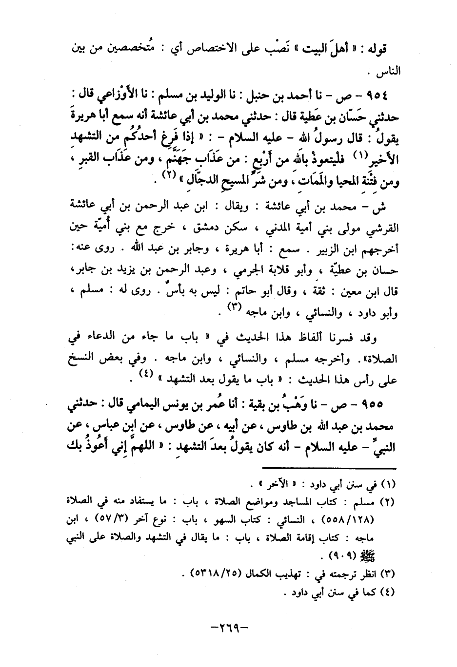 954-ص- نا أحمد بن حنبل: نا الوليد بن مسلم: نا الأوزاعي قال: حدثنا حَسّان بن عَطية قال: حدثني محمد بن أبي عائشة أنه سمع أبا هريرةَ يقولُ: قال رسولُ الله- عليه السلام-: "إذا فرِغ أحدُكُم من التشهد الأخيرِ (1) فليتعوذ بالله من أرْبع: من عَنَاب جَهَنم، ومن عَذاب القبرِ، ومن فِتْنةِ المحيا والمَمَاتِ، ومن شَر المسيح الدجّاَلِ" (2) .