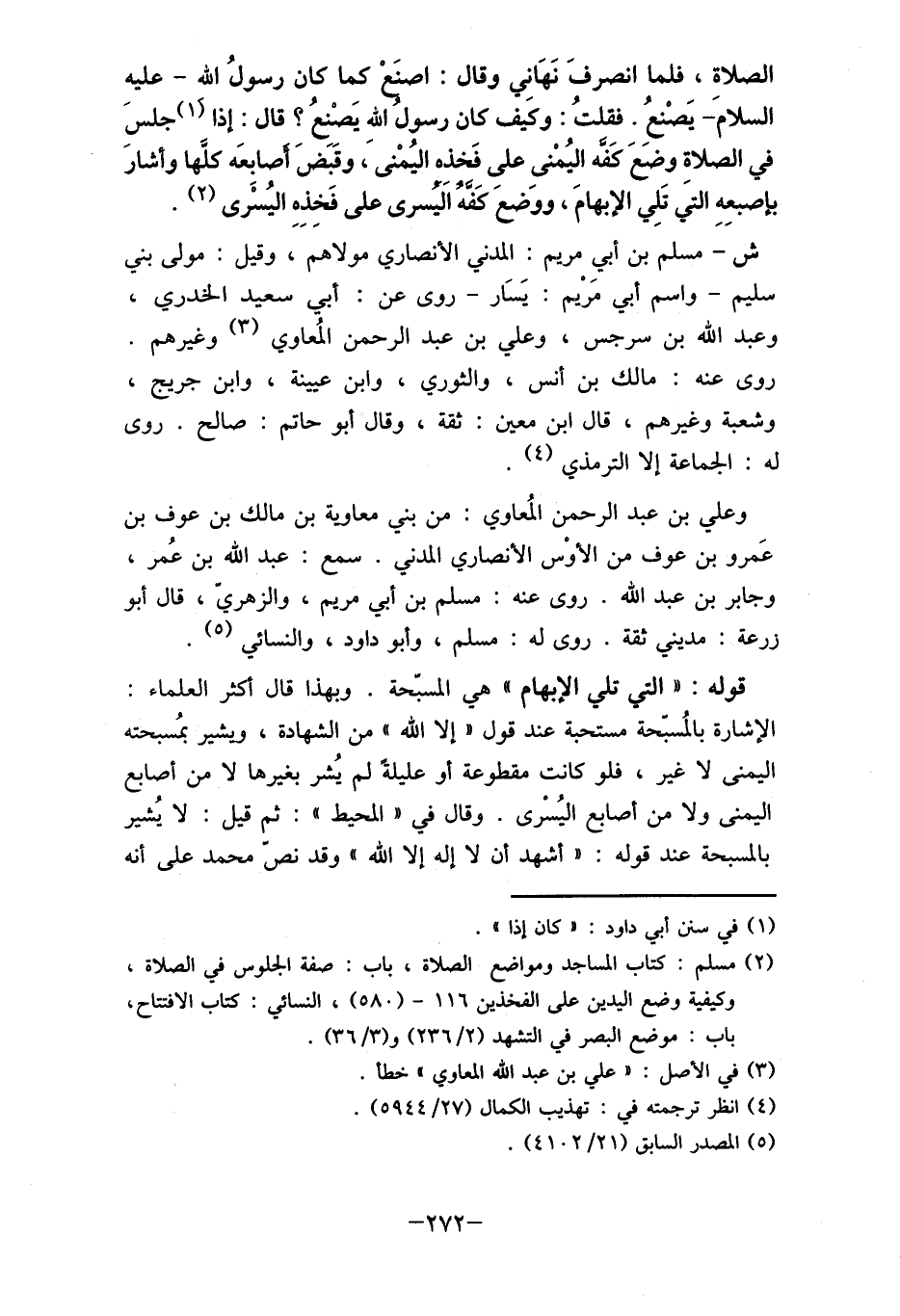 الصلاة، فلما انصرفَ نَهَاني وقال: اصنع كما كان رسولُ الله- عليه السلامَ- يَصْنعُ. فقلتُ: وكَيف كان رسول الله يَصْنعُ؟ قال: إذا (1) جلسَ في الصلاة وضعَ كَفه اليُمْنىِ علىِ فَخذه اليُمْنى، وقَبَض أصابعَه كلَّها وأشارَ بإصبعِهِ التيَ تَلِي الإبهامَ، ووضع كَفة اَليسرى على فَخِذِهِ اليُسرى (2) . ش- مسلم بن أبي مريم: المدني الأنصاري مولاهم، وقيل: مولى بني سليم- واسم أبي مَرْيم: يَسَار- روى عن: أبي سعيد الخدري، وعبد الله بن سرجس، وعلي بن عبد الرحمن المُعاوي (3) وغيرهم. روى عنه: مالك بن أنس، والثوري، وابن عيينة، وابن جريج، وشعبة وغيرهم، قال ابن معين: ثقة، وقال أبو حاتم: صالح. روى له: الجماعة إلا الترمذي (4) .