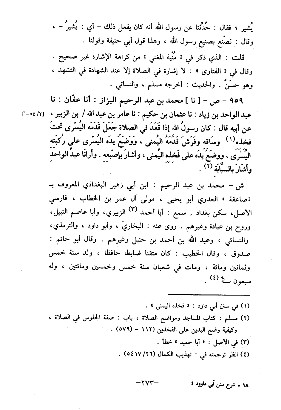 959-ص- أنا، محمد بن عبد الرحيم البزاز: أنا عفّان: نا عبد الواحد بن زياد: نا عثمان بن حكيم: نا عامر بن عبد الله/ بن الزبير، [2/54 - أ] عن أبيه قال: كان رسولُ الله إذا قَعَدَ في الصلاةِ جَعَلَ قَدَمَه اليُسْرى تحتَ فخذه (1) وسَاقِه وفَرَشَ قَدًمَهُ اليُمنى، وَوَضَعَ يده اليُسْرى على رُكبَته اليُسرًى، ووضَعَ يدَه على فَخِذِهِ اليُمنى، وأشارَ بإصبعِهِ. وأرانَا عبدُ الواحَدَ وأَشَارَ بالسبابَةِ (2) .