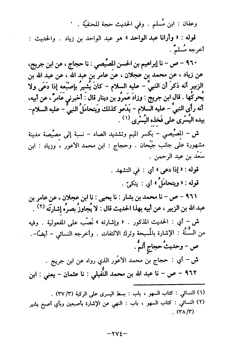 960- ص- نا إبراهيم بن الحسن المِصيصي: نا حجاج، عن ابن جريج، عن زياد، عن محمد بن عجلان، عن عامر بن عبد الله، عن عبد الله بن الزبير أنه ذكرَ أن النبي- عليه السلام- كانَ يُشيرُ بإصْبَعه إذا دَعَى ولا يُحركُها. قال ابن جريج: "زادَ عَمرُو بن دينارِ قال: أخبرني عًامرٌ، عن أبيه، أنه رأى النبي- عليه السلام- يَدعو كذلك ويتحامَلُ النبي- عليه السلام- بيده اليُسْرى على فَخِذهِ اليُسْرى (1) .