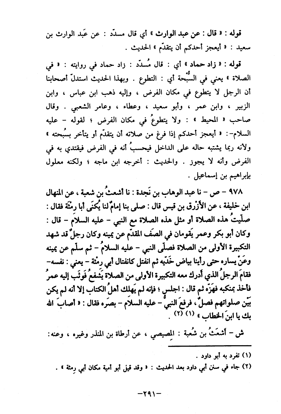 978- ص- نا عبد الوهاب بن نَجدة: نا أشعثُ بن شعبة، عن المنهال ابن خليفة، عن الأزْرق بن قيس قال: صلى بنا إمام لنا يُكنَى أبا رِمْثَة فقال: صليتُ هذه الصلاة أو مثل هذه الصلاة مع النبي- عليه السلام- قال: وكان أبو بكر وعمر يَقومان في الصَف المقدم عن يمينه وكان رجل قد شهد التكبيرة الأولى من الصلاة فصلى النبي- عليه السلامُ- ثم سلم عن يمينه وعَن يساره حتى رأينا بياض خَديه ثم انفتل كانفتال أبي رمثة- يعني: نفسه- فقامَ الرجلُ الذي أدرك معه التكبيرة الأولى من الصلاة يشفعُ فَوثَب إليه عمرُ فأخذ بمنكبه فهَزة ثم قال: اجلس؛ فإنه لم يَهلك أهلُ الكتاب إلا أنه لم يكن بين صلواتهم فصل، فرفعَ النبي- عليه السلام- بصره فقال: " أصابَ الله بك يا ابنَ الخطاب " (1) (2) .