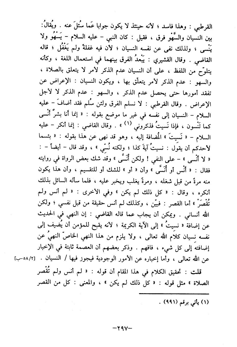 القرطبي: وهذا فاسد؛ لأنه حينئذ لا يكون جوابا عَما سُئلَ عنه. ويُقالُ: بين النسيان والسهْو فرق، فقيل: كان النبي- عليه السلام- يَسْهُو ولا يَنسى؛ ولذلك نفى عن نفسه النسيان؛ لأن فيه غفلة ولم يَغْفُل، قاله القاضي. وقال القشيري: يَبْعدُ الفرق بينهما في استعمال اللغة، وكأنه يتلوّح من اللفظ، على أن النسيان عدم الذكر لأمر لا يتعلق بالصلاة، والسهو: عدم الذكر لأمر يتعلّق بها، ويكون النسيان: الإعراض عن تفقد أمورها حتى يحصل عدم الذكر، والسهو: عدم الذكر لا لأجل الإعراض. وقال القرطبي: لا نسلم الفرق ولئن سُلم فقد أضافَ- عليه السلام- النسيان إلى نفسه في غير ما موضع بقوله: " إنما أنا بشرٌ أنسى كما تَنْسون، فإذا نَسيتُ فذكروني (1) ". وقال القاضي: إنما أنكر- عليه السلام- " نَسِيتَ " المُضافة إليه، وهو قد نهى عن هذا بقوله: " بئسما لأحدكم أن يقول: نسيتُ آيةَ كذا؛ ولكنه نُسِّي "، وقد قال- أيضا-:"لا أنسى "- على النفي" ولكن أُنَسَّى " وقد شك بعض الرواة في روايته فقال: " انْس أو أُنَسَّى" وأن "أو" للشك أو للتقسيم، وأن هذا يكون منه مرة من قبل شغله، ومرة يغلب ويخبر عليه، فلما سأله السائل بذلك أنكره، وقال: " كل ذلك لم يكن " وفي الأخرى: " لم أنس ولم تُقْصَرْ " أما القصر: فبين، وكذلك لم أنس حقيقة من قبل نفسي؛ ولكن الله أنساني. ويمكن أن يجاب عما قاله القاضي: إن النهي في الحديث عن إضافة " نسيتُ " إلى الآية الكريمة؛ لأنه يقبح للمؤمن أن يُضيف إلى نفسه نسيان كلاَم الله تعالى، ولا يلزم من هذا النهي الخاص" النهيُ عن إضافتهَ إلى كل شيء، فافهم. وذكر بعضهم أن العصمة ثابتة في الإخبار عن الله تعالى، وأما إخباره عن الأمور الوجودية فيجوز فيها/ النسيان. [2/58 - ب] قلت: تحقيق الكلام في هذا المقام أن قوله: " لم أنس ولم تُقْصر الصلاة" مثل قوله: "كل ذلك لم يكن "، والمعنى: كل من القصر