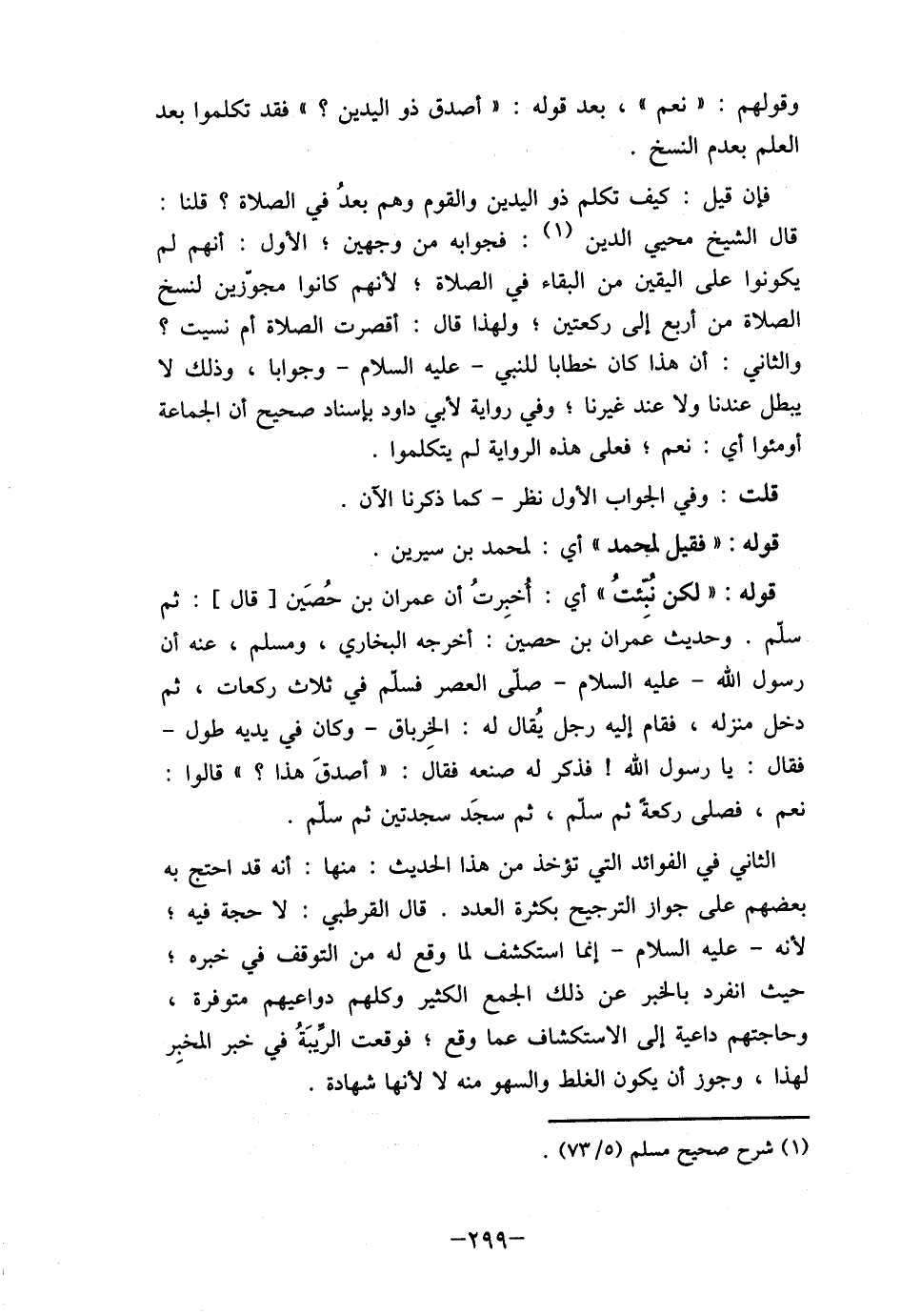 قال الشيخ محيي الدين (1) : فجوابه من وجهين؛ الأول: أنهم لم يكونوا على اليقين من البقاء في الصلاة؛ لأنهم كانوا مجوزين لنسخ الصلاة من أربع إلى ركعتين؟ ولهذا قال: أقصرت الصلاة أم نسيت؟ والثاني: أن هذا كان خطابا للنبي- عليه السلام- وجوابا، وذلك لا يبطل عندنا ولا عند غيرنا؛ وفي رواية لأبي داود بإسناد صحيح أن الجماعة أومئوا أي: نعم؛ فعلى هذه الرواية لم يتكلموا.