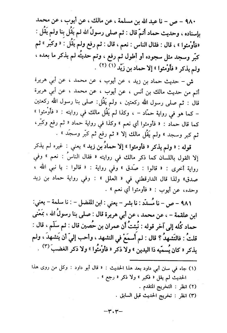 ش- حديث حماد بن زيد، عن أيوب، عن محمد، عن أبي هريرة أتم من حديث مالك بن أنس، عن أيوب، عن محمد، عن أبي هريرة قال: ثم صلى رسول الله ركعتين، ولم يَقُل: صلى بنا رسول الله ركعتين - كما هو في رواية حمّاد-، وكذا لم يَقُل مالك في روايته: "فأوْمئوا " كما قال حماد: " فأومئوا أي نعم " وكذا في رواية حماد " ثم رفع وكبر، ثم كبر وسجد " ولم يَقُل مالك إلا " ثم رفع ثم كبر وسجَد ".