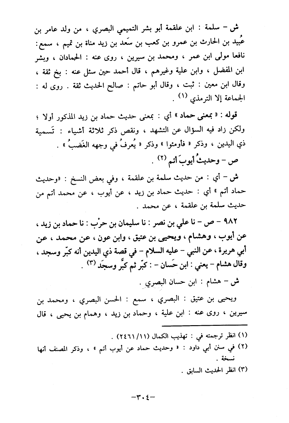 ش- أي: من حديث سلمة بن علقمة، وفي بعض النسخ: "وحديث حماد أتم " أي: حديث حماد بن زيد، عن أيوب، عن محمد أتم من حديث سلمة بن علقمة، عن محمد.