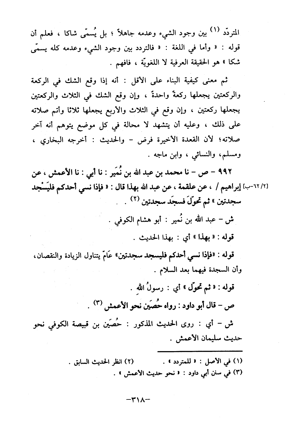 992- ص- نا محمد بن عبد الله بن نُمَير: نا أبي: نا الأعمش، عن إبراهيم/، عن علقمة، عن عبد الله بهذا قال: "فإذا نسي أحدكم فليَسْجد سجدتين " ثم تحولَ فسجَد سجدتين (2) ..