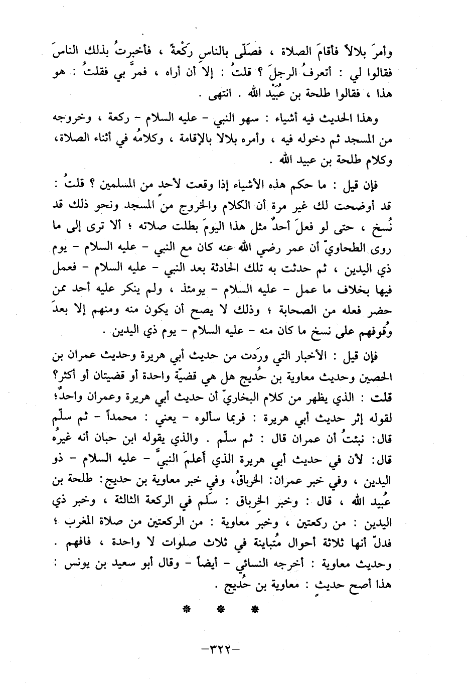 قد أوضحت لك غير مرة ابن الكلام والخروج منه المسجد ونحو ذلك قد نُسخ، حتى لو فعلَ احد مثل هذا اليومَ بطلت صلاته؛ ألا ترى إلى ما روى الطحاويّ أن عمر رضي الله عنه كان مع النبي- عليه السلام- يوم ذي اليدين، ثم حدثت به تلك الحادثة بعد النبي- عليه السلام- فعمل فيها بخلاف ما عمل- عليه السلام- يومئذ، ولم ينكر عليه أحد ممن حضر فعله من الصحابة؛ وذلك لا يصح أن يكون منه ومنهم إلا بعدَ وُقوفهم على نسخ ما كان منه- عليه السلام- يوم ذي اليدين.