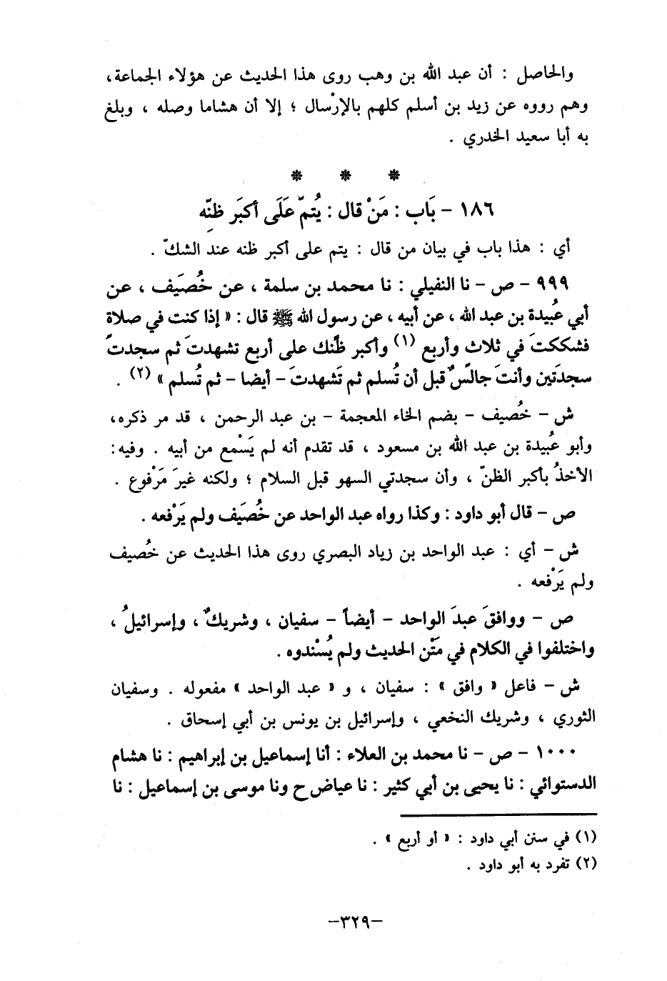 999- ص- نا النفيلي: نا محمد بن سلمي، عن خُصَيف، عن أبى عُبيدة بن عبد الله، عن أبيه، عن رسول الله يكره قال: "إذا كنت في صلاة فشككتَ في ثلاث وأربع (1) وكبر ظنك علي أربع تشهدتَ ثم سجدتَ سجدتين وأنثَ جالسين قبل أن تُسلم ثم تَشهدت- أيضا- ثم تُسلم " (2) . ش- خُصيف- بضم الخاء المعجمة- بن عبد الرحمن، قد مر ذكره، وأبو عُبيدة بن عبد الله بن مسعود، قد تقدم أنه لم يَسْمع من أبيه. وفيه: الأخذُ بخبر الظن، وأن سجدتي السهو قبل السلام؟ ولكنه غيرَ مَرْفوع. ص- قال أبو داود: وكذا رواه عبد الواحد عن خُصَيف ولم يَرْفعه.