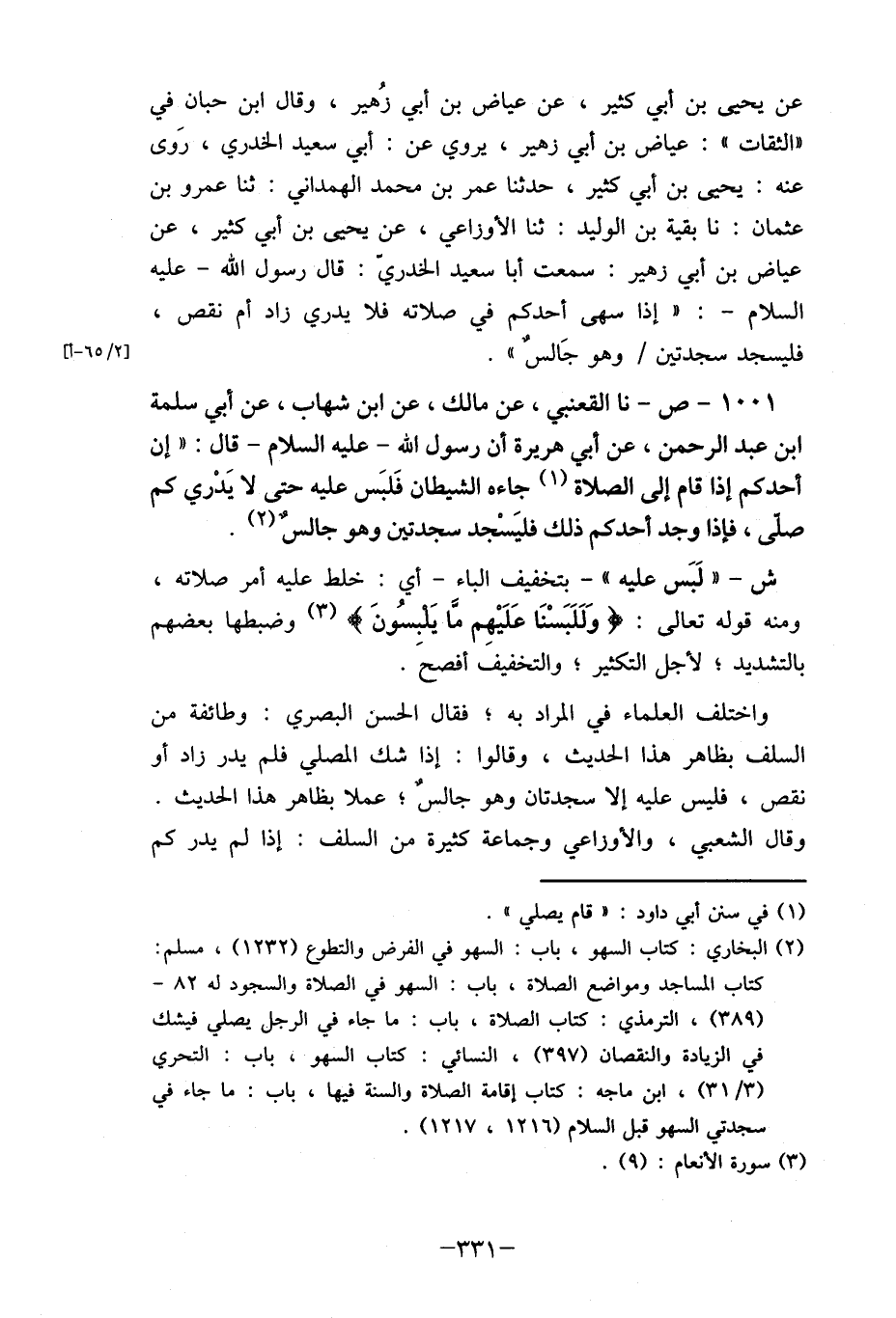 1001- ص- نا القعنبي، عن مالك، عن ابن شهاب، عن أبي كلمة ابن عبد الرحمن، عن أبي هريرة أن رسول الله- عليه السلام- قال: ما إن أحدكم إذا قام إلى الصلاة (1) جاءه الشيطان فَلبَس عليه حتى لا يَدْري كم صلى، فإذا وجد أحدكم ذلك فليَسْجد سجدتين وهو جالس (2) .