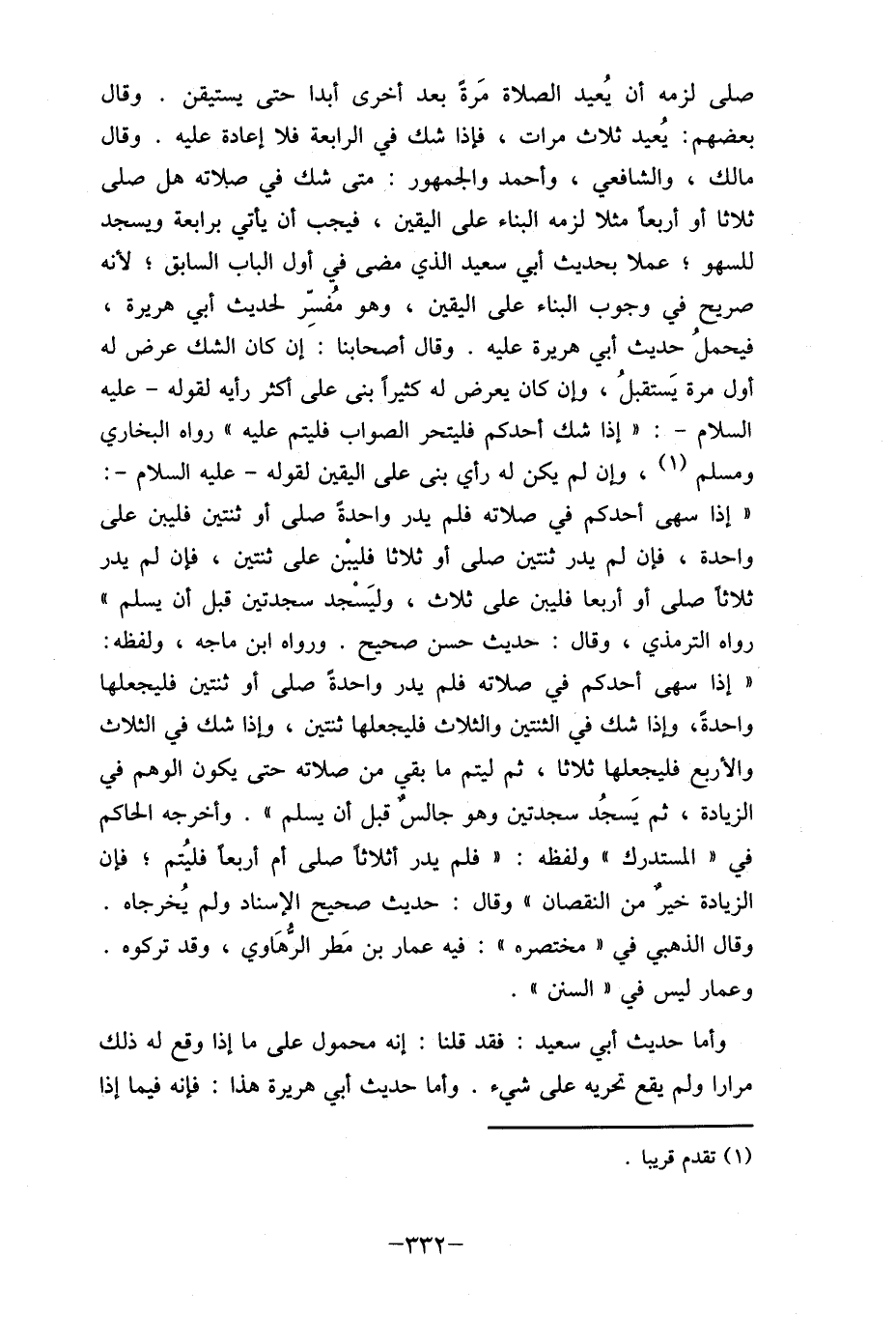 صلى لزمه أن يُعيد الصلاة مَرةً بعد أخرى أبدا حتى يستيقن. وقال بعضهم: يُعيد ثلاث مرات، فإذا شك في الرابعة فلا إعادة عليه. وقال مالك، والشافعي، وأحمد والجمهور: متى شك في صلاته هل صلى ثلاثا أو أربعا مثلا لزمه البناء على اليقين، فيجب أن يأتي برابعة وأمجد للسهو؛ عملا بحديث أبي سعيد الذي مضى في أول الباب السابق؛ لأنه صريح في وجوب البناء على اليقين، وهو مُفسِر لحديث أبي هريرة، فيحملُ حديث أبي هريرة عليه. وقال أصحابنا: إن كان الشك عرض له أول مرة يَستقبلُ، وإن كان يعرض له كثيراً بنى على كثر رأيه لقوله- عليه السلام-: " إذا شك أحدكم فليتحر الصواب فليتم عليه ما رواه البخاري ومسلم (1) ، وإن لم يكن له رأي بنى على اليقين لقوله- عليه السلام-: "إذا سهى أحدكم في صلاته فلم يدر واحدةً صلى أو ثنتين فليبن على واحدة، فإن لم يدر ثنتين صلى أو ثلاثا فليبْن على ثنتين، فإن لم يدر ثلاثا صلى أو أربعا فليبن على ثلاث، وليَسْجد سجدتين قبل أن يسلمه رواه الترمذي، وقال: حديث حسن صحيح. ورواه ابن ماجه، ولفظه: " إذا سهى أحدكم في صلاته فلم يدر واحدةً صلى الو ثنتين فليجعلها واحدةً، وإذا شك في الثنتين والثلاث فليجعلها ثنتين، وإذا شك في الثلاث والأربع فليجعلها ثلاثا، ثم ليتم ما بقي من صلاته حتى يكون الوهم في الزيادة، ثم يَسجُد سجدتين وهو جالسٌ قبل أن يسلم،. وأخرجه الحاكم في "المستدرك " ولفظه: "فلم يدر أثلاثا صلى أم أربعا فليُتم؛ فإن الزيادة خيرٌ من النقصان" وقال: حديث صحيح الإسناد ولم يُخرجاه. وقال الذهبي في " مختصرها: فيه عمار بن مَطر الرهاوي، وقد تركوه. وعمار ليس في "السنن".
