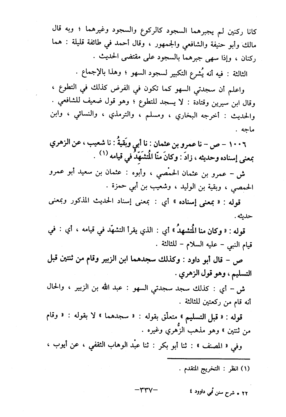 1006- ص- نا عمرو بن عثمان: نا أبي وبَقيةُ: نا شعيب، عن الزهري بمعنى إسناده وحديثه، زادَ: وكانَ منّا المُتشَهد في قيامه (1) .