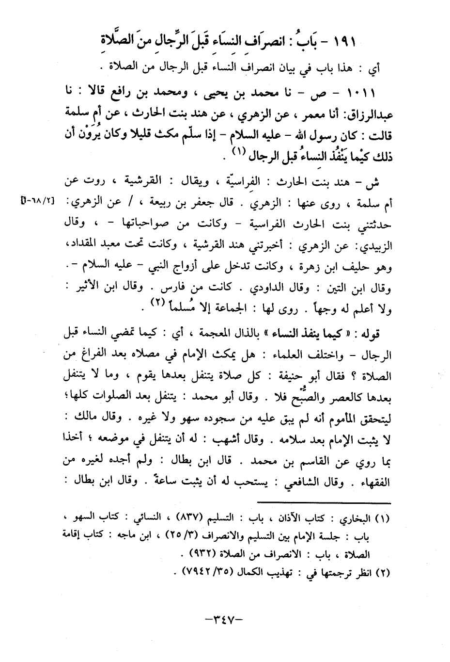 1011- ص- نا محمد بن يحيى، ومحمد بن رافع قالا: نا عبد الرزاق: أنا معمر، عن الزهري، عن هند بنت الحارث، عن أمر كلمة قالت: كان رسول الله- عليه السلام- إذا سلم مكث قليلا وكان يُروْن أن ذلك كيْما يَنْفُذ النِساءُ قبل الرجال (1) .