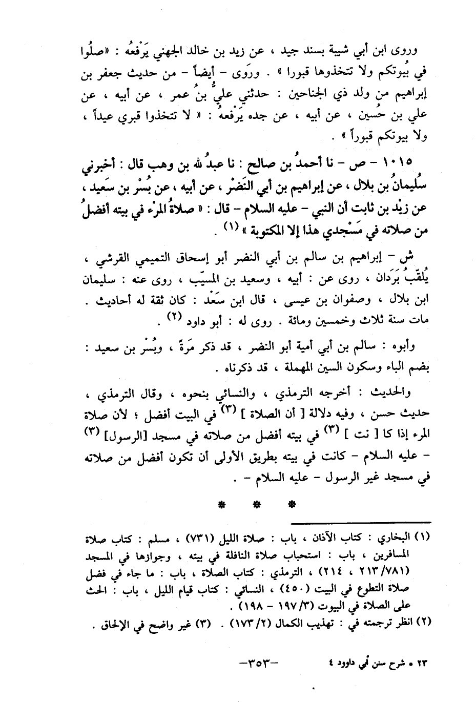1015- ص- نا أحمدُ بن صالح: نا عبدُ لله بن وهب قال: أخبرني سُليمانُ بن بلال، عن إبراهيم بن أبي النَضْر، عن أبيه، عن بُسْر بن سَعيد، عن زيْد بن ثابت أن النبي- عليه السلام- قال: " صلاةُ المرْء في بيته أفضلُ من صلاته في مَسْجدي هذا إلا المكتوبة " (1) .