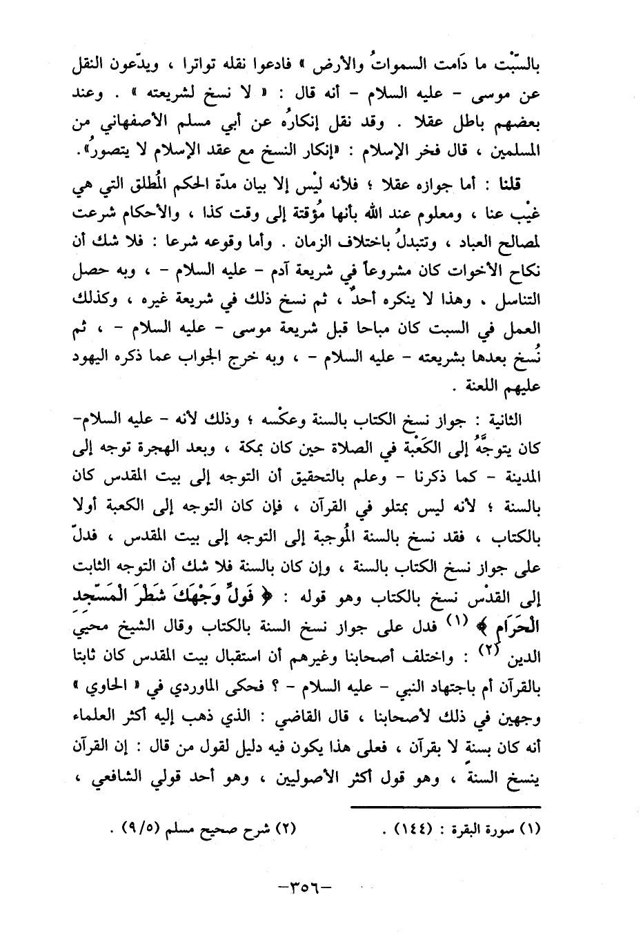 الثانية: جواز نسخ الكتاب بالسنة وعكْسه؛ وذلك لأنه- عليه السلام- كان يتوجهُ إلى الكَعْبة في الصلاة حين كان بمكة، وبعد الهجرة توجه إلى المدينة- كما ذكرنا- وعلم بالتحقيق أن التوجه إلى بيت المقدس كان بالسنة؛ لأنه ليس بمتلو في القرآن، فإن كان التوجه إلى الكعبة أولا بالكتاب، فقد نسخ بالسنة المُوجبة إلى التوجه إلى بيت المقدس، فدل على جواز نسخ الكتاب بالسنة، وأن كان بالسنة فلا شك أن التوجه الثابت إلى القدْس نسخ بالكتاب وهو قوله: "فَول وَجْهَكَ شَطرَ المسجِدِ الحَرَام" (1) فدل على جواز نسخ السنة بالكتاب وقال الشيخ محيي الدين (2) : واختلف أصحابنا وغيرهم أن استقبال بيت المقدس كان ثابتا بالقرآن أم باجتهاد النبي- عليه السلام-؟ فحكى للماوردي في "الحاوي" وجهين في ذلك لأصحابنا، قال القاضي: الذي ذهب إليه كثر العلماء أنه كان بسنة لا بقرآن، فعلى هذا يكون فيه دليل لقول من قال: إن القرآن ينسخ السنةَ، وهو قول كثر الأصولية، وهو أحد قولي الشافعي،