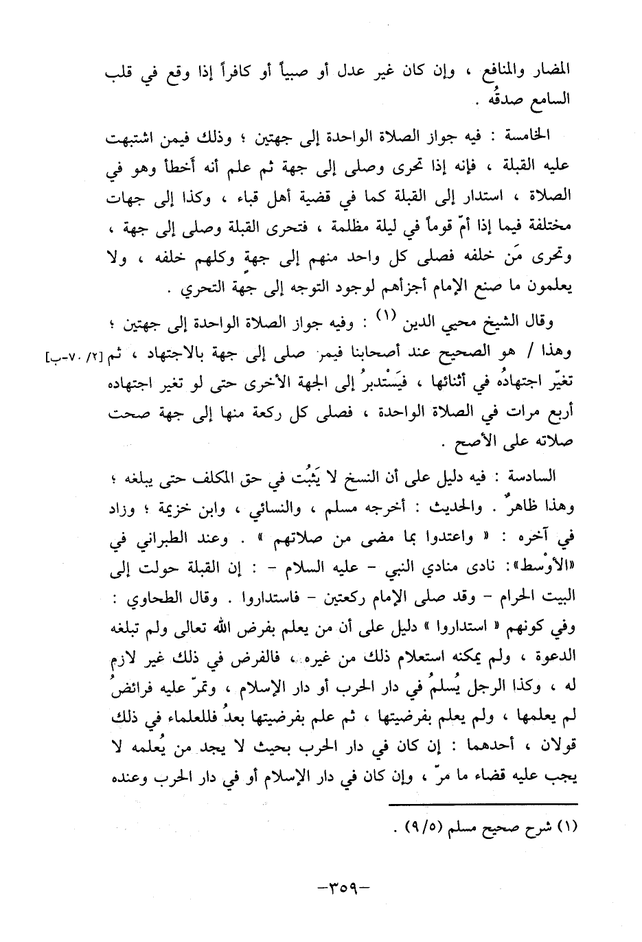 وقالت الشيخ محيي الدين (1) : وفيه جواز الصلاة الواحدة إلى جهتين