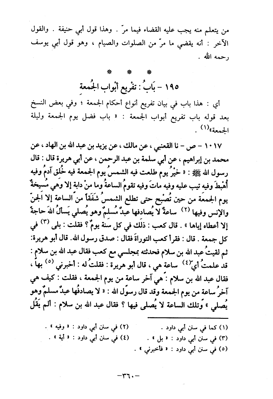 1017- ص- نا القعنبي، عن مالك، عن يزيد بن عبد الله بن الهاد، عن محمد بن إبراهيم، عن أبي سلمة بن عبد الرحمن، عن أبي هريرة قال: قال رسول الله - صلى الله عليه وسلم -: " خيْرُ يوم طلعت فيه الشمسُ يوم الجمعة فيه خُلِق اَدمُ وفيه اهْبطَ وفيه تيب عليه وفيه ماتَ وفيه تقومُ الساعةُ وما منْ دابة إلا وهي مُسيخة يوم الجمعَة من حين تُصْبح حتى تطلع الشمسُ شَفَقاً من الساعة إلا اَلجن والإنس وفيها (2) ساعة لا يُصادفها عبدٌ مُسلِمٌ وهو يُصلي يَسألُ الله حاجة إلا أعطاه إياها ". قال كعب: ذلَك في كل سنة يوم؟ فقلت: بلى (3) في كل جمعة. قال: فقرأ كعب التوراةَ فقال: صدق رسول الله. قال أبو هريرة: ثم لقيتُ عبد الله بن سلام فحدثته بمجلسي مع كعب فقال عبد الله بن سلام: قد علمتُ أيّ (4) ساعة هي، قال أبو هريرة: فقلتُ له: أخبرني (5) بها، فقال عبد الله بن سلام: هي آخر ساعة من يوم الجمعة، فقلت: كيف هي آخرُ ساعة من يوم الجمعة وقد قال رسوَل الله: " لا يصادفُها عبد مسلم وهو يُصلي، وتلك الساعة لا يصلى فيها؟ فقال عبد الله بن سلام: ألم يَقُل