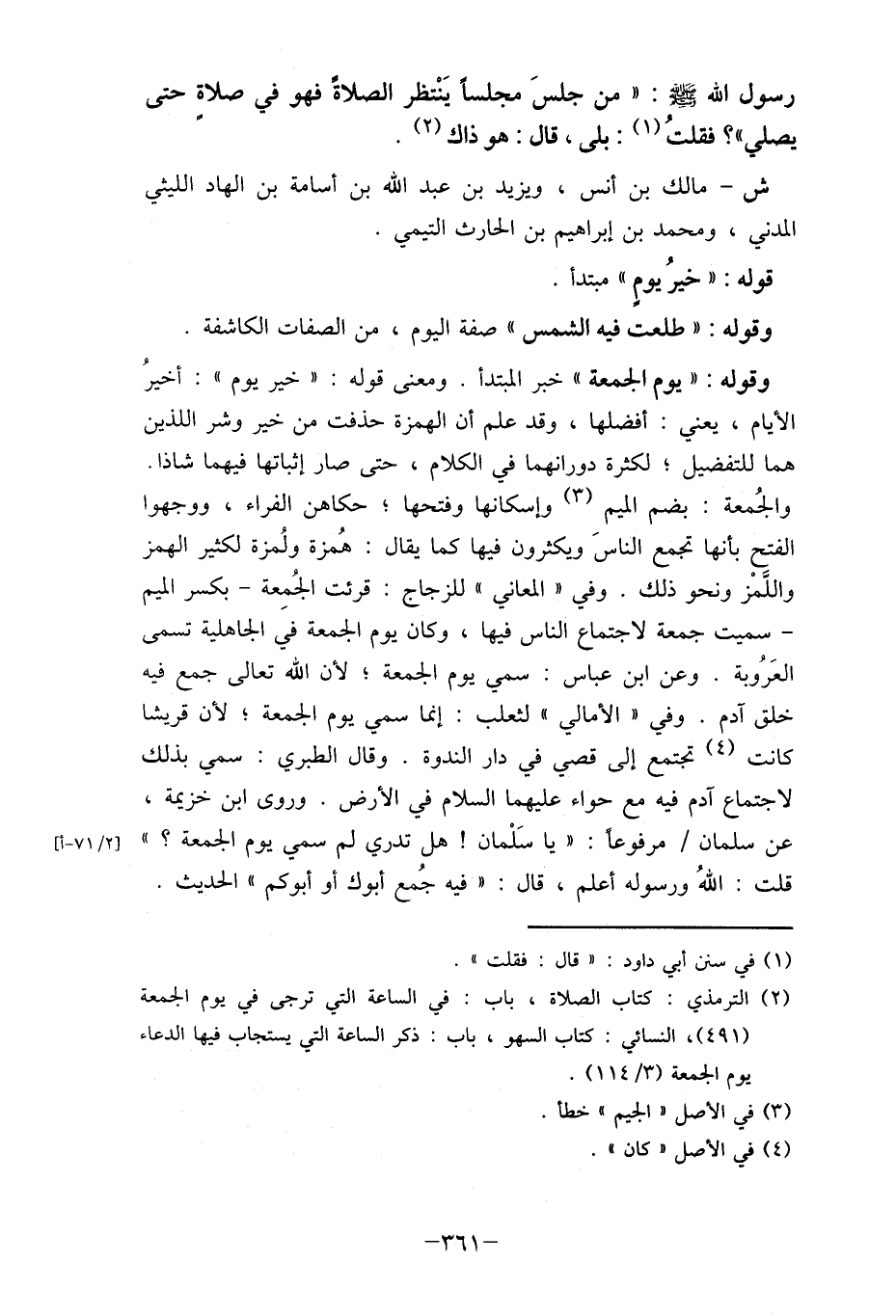 وقوله: " طلعت فيه الشمس " صفة اليوم، من الصفات الكاشفة. وقوله: " يوم الجمعة " خبر المبتدأ. ومعنى قوله: " خير يوم ": أخيرُ الأيام، يعني: أفضلها، وقد علم أن الهمزة حذفت من خير وشر اللذين هما للتفضيل؛ لكثرة دورانهما في الكلام، حتى صار إثباتها فيهما شاذا. والجُمعة: بضم الميم (3) وإسكانها وفتحها؛ حكاها الفراء، ووجهوا الفتح بأنها تجمع الناسَ ويكثرون فيها كما يقال: هُمزة ولُمزة لكثير الهمز واللَّمْز ونحو ذلك. وفي " المعاني " للزجاج: قرئت الجُمِعة- بكسر الميم - سميت جمعة لاجتماع الناس فيها، وكان يوم الجمعة في الجاهلية تسمى العَرُوبة. وعن ابن عباس: سمي يوم الجمعة لأن الله تعالى جمع فيه خلق آدم. وفي " الأمالي " لثعلب: إنما سمي يوم الجمعة؛ لأن قريشا كانت (4) تجتمع إلى قصي في دار الندوة. وقال الطبري: سمي بذلك لاجتماع آدم فيه مع حواء عليهما السلام في الأرض. وروى ابن خزيمة، عن سلمان/ مرفوعاً " يا سَلْمان" هل تدري لم سمي يوم الجمعة؟ " قلت: اللهُ ورسوله أعلم، قال: " فيه جُمع أبوك أو أبوكم " الحديث.
