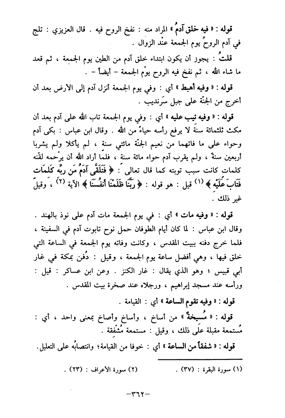 قوله: " وفيه تيب عليه " أي: وفي يوم الجمعة تاب الله على اَدم بعد أن مكث ثلاثمائة سنةَ لا يرفع رأسه حياء من الله. وقال ابن عباس: بكى آدم وحواء على ما فاتهما من نعيم الجنّة مائتي سنة، لم يأكلا ولم يشربا أربعين سنةً، ولم يقرب آدم حواء مائة سنة، فلمًا أراد الله أن يرْحمه لقنه كلمات كانت سبب توبته كما قال تعالى: {فَتَلَقَّى آدَمُ مَن ربه كَلمَات فَتَابَ عًلَيْهِ} (1) قيل: هو قوله: {ربنا ظَلَمْنَا أَنفُسَنَا} الآية (2) ،َ وقيلَ غير ذلك.