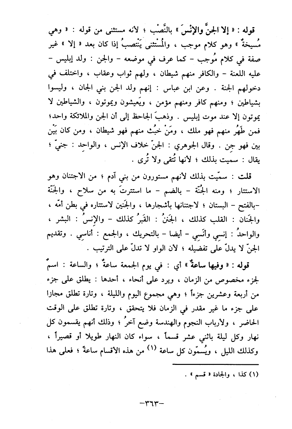 قوله: " إلا الجنُّ والإنْسَ " بالنَصْب؛ لأنه مستثنى من قوله: " وهي مُسيخةٌ " وهو كلام موجب، والمُسْتثنى يَنْتصبُ إذا كان بعد "الا" غير صفة في كلام مُوجب- كما عرف في موضعه- والجن: ولد إبليس- عليه اللعنة- والكافر منهم شيطان، ولهم ثواب وعقاب، واختلف في دخولهم الجنة. وعن ابن عباس: إنهمِ ولد الجن بني الجان، وليسوا بشياطين؛ ومنهم كافر ومنهم مؤمن، ويعيشون ويموتون، والشياطين لا يموتون إلا عند موت إبليس. وذهبَ الجاحظ إلى أن الجن والملائكة واحد. فمن طَهُر منهم فهو ملك، ومَنْ خبُث منهم فهو شيطان، ومن كان بَيْن بين فهو جِن. وقال الجوهري: الجن خلاف الإنس، والواحِد: جني؛ يقال: سميت بذلك؛ لأنها تُتقى ولا تُرى.