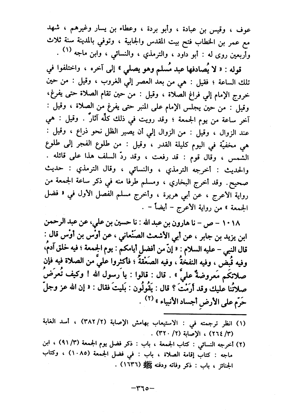 1018- ص- نا هارون بن عبد الله: نا حسين بن علي، عن عبد الرحمن ابن يزيد بن جابر، عن أبي الأشعث الصَنْعاني، عن أوْس بن أوْس قال: قال النبي- عليه السلام: " إنّ من أفضل أيامكم: يوم الجمعة؛ فيه خلق آدمُ، وفيه قُبض، وفيه النفخةُ، وفيه الصَعْقة؛ فأكثروا علي من الصلاة فيه فإن صلاتكَم مَعروضة علي". قال: قالوا: ياَ رسول الله! وكيف تُعرَضُ صلاتُنا عليك وقد أرَمْتَ؟ قال: يَقُولُون: بَليتَ فقال: "إن الله عز وجل حَرم على الأرضِ أجساد الأنبياء" (2) .