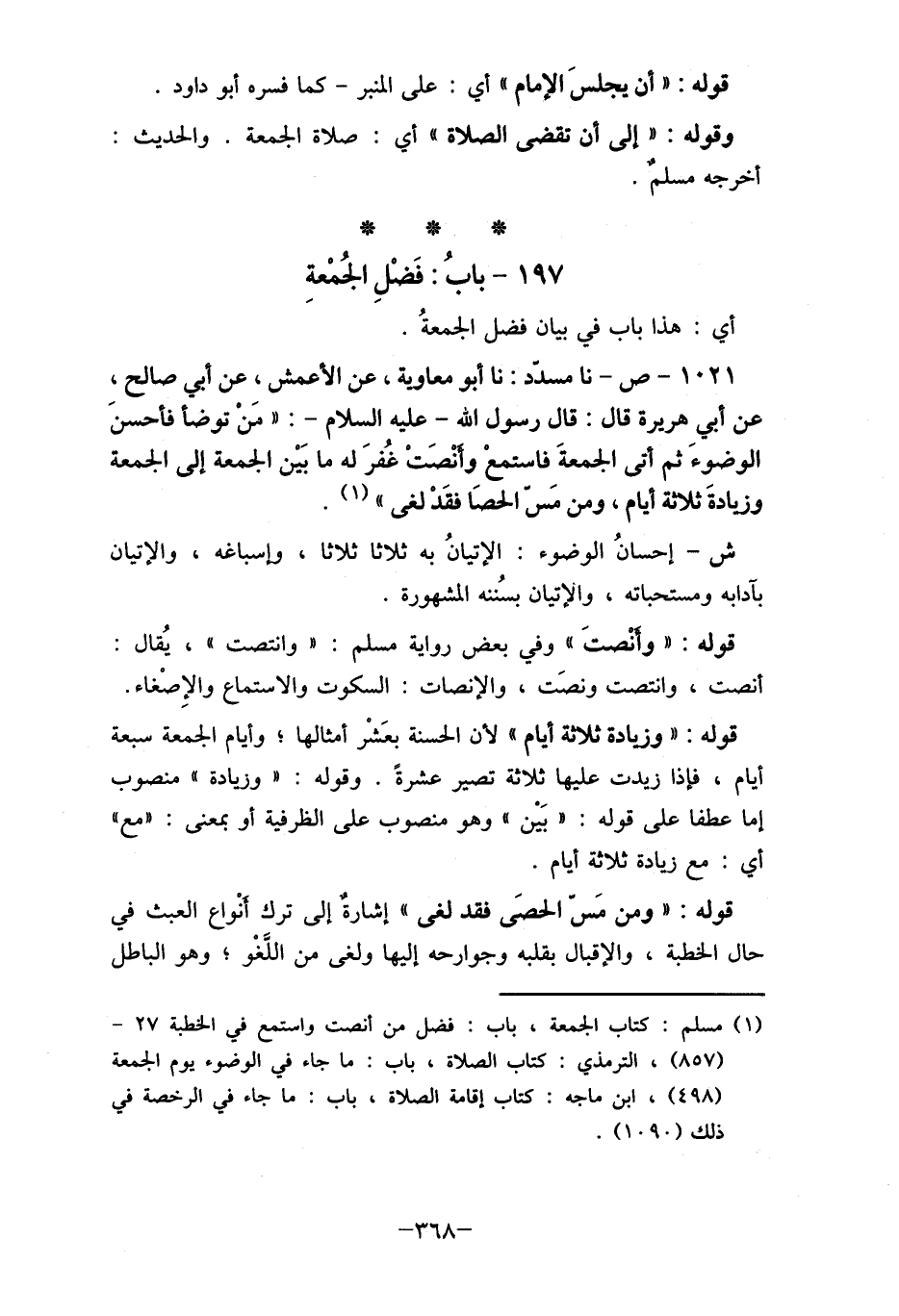 (1) مسلم: كتاب الجمعة، باب: فضل من أنصت واستمع في الخطبة 27- (857) ، الترمذي: كتاب الصلاة، باب: ما جاء في الوضوء يوم الجمعة (498) ، ابن ماجه: كتاب إقامة الصلاة، باب: ما جاء في الرخصة في ذلك (1090) .