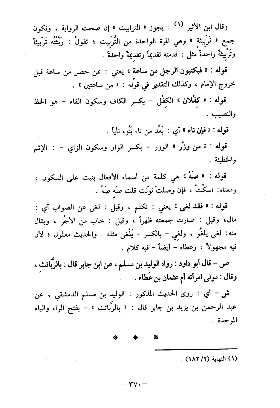 ص- قال أبو داود: رواه الوليد بن مسلم، عن ابن جابر قال: بالربائث، وقال: مولى امرأته أم عثمان بن عَطاء.