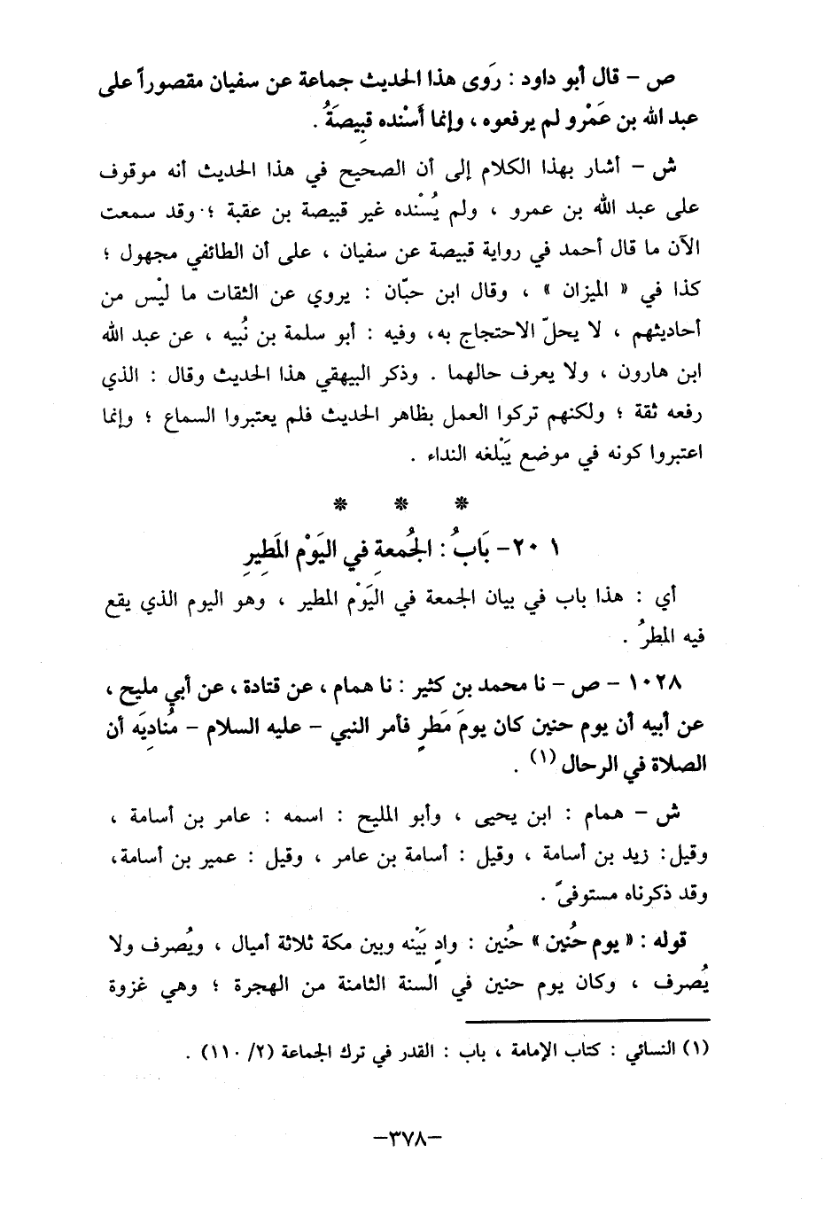 1028- ص- نا محمد بن كثير: نا همام، عن قتادة، عن أبي مليح، عن أبيه أن يوم حنين كان يومَ مَطر فأمر النبي- عليه السلام- مُناديَه أن الصلاة في الرحال (1) .