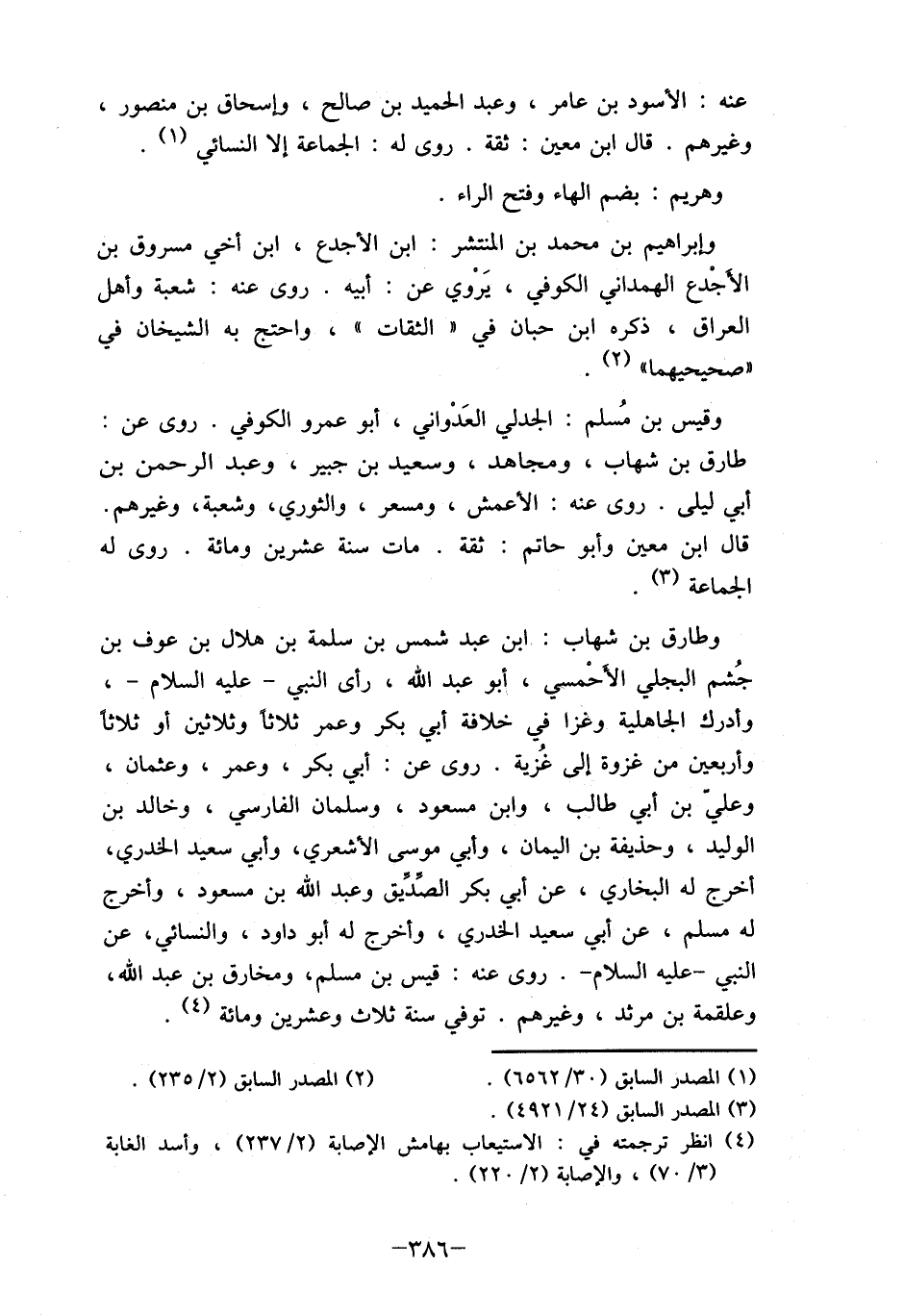 وطارق بن شهاب: ابن عبد شمس بن سلمة بن هلال بن عوف بن جُشم البجلي الأحْمسي، أبو عبد الله، رأى النبي- عليه السلام-، وأدرك الجاهلية وغزا في خلافة أبي بكر وعمر ثلاثاً وثلاثين أو ثلاثاً وأربعين من غزوة إلى غزية. روى عن: أبي بكر، وعمر، وعثمان، وعلي بن أبي طالب، وابن مسعود، وسلمان الفارسي، وخالد بن الوليد، وحذيفة بن اليمان، وأبي موسى الأشعري، وأبي سعيد الخدري، أخرج له البخاري، عن أبي بكر الصِّدِّيق وعبد الله بن مسعود، وأخرج له مسلم، عن أبي سعيد الخدري، وأخرج له أبو داود، والنسائي، عن النبي- عليه السلام-. روى عنه: قيس بن مسلم، ومخارج بن عبد الله، وعلقمة بن مرثد، وغيرهم. توفي سنة ثلاث وعشرين ومائة (4) .