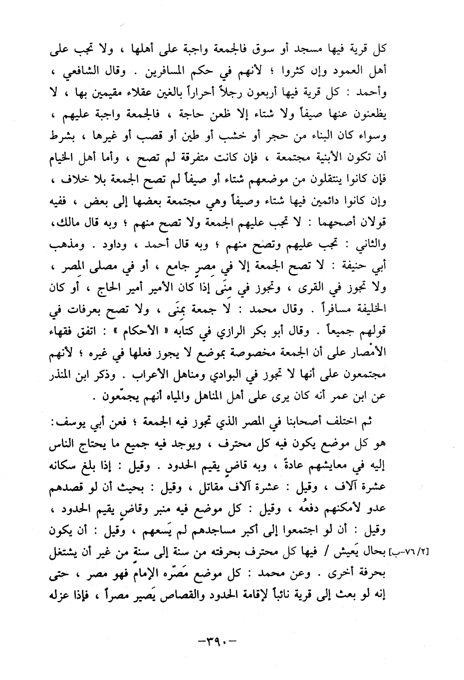 كل قرية فيها مسجد أو سوق فالجمعة واجبة على أهلها، ولا تجب على أهل العمود وإن كثروا؛ لأنهم في حكم المسافرين. وقال الشافعي، وأحمد: كل قرية فيها أربعون رجلاً أحراراً بالغين عقلاء مقيمين بها، لا يظعنون عنها صيفا ولا شتاء إلا ظعن حاجة، فالجمعة واجبة عليهم، وسواء كان البناء من حجر أو خشب أو طين أو قصب أو غيرها، بشرط أن تكون الأبنية مجتمعة، فإن كانت متفرقة لم تصح، وأما أهل الخيام فإن كانوا ينتقلون من موضعهم شتاء أو صيفاً لم تصح الجمعة بلا خلاف، وإن كانوا دائمين فيها شتاء وصيفاً وهي مجتمعة بعضها إلى بعض، ففيه قولان أصحهما: لا تجب عليهم الجمعة ولا تصح منهم؛ وبه قال مالك، والثاني: تجب عليهم وتصح منهم؛ وبه قال أحمد، وداود. ومذهب أبي حنيفة: لا تصح الجمعة إلا في مِصرٍ جامع، أو في مصلى المصر، ولا تجوز في القرى، وتجوز في منَى إذا كان الأمير أمير الحاج، أَو كان الخليفة مسافراً. وقال محمد: لَا جمعة بمنَى، ولا تصح بعرفات في قولهم جميعاً وقال أبو بكر الرازي في كتاَبه" الأحكام ": اتفق فقهاء الأمْصار على أن الجمعة مخصوصة بموضع لا يجوز فعلها في غيره؛ لأنهم مجتمعون على أنها لا تجوز في البوادي ومناهل الأعراب. وذكر ابن المنذر عن ابن عمر أنه كان يرى على أهل المناهل والمياه أنهم يجمعون.